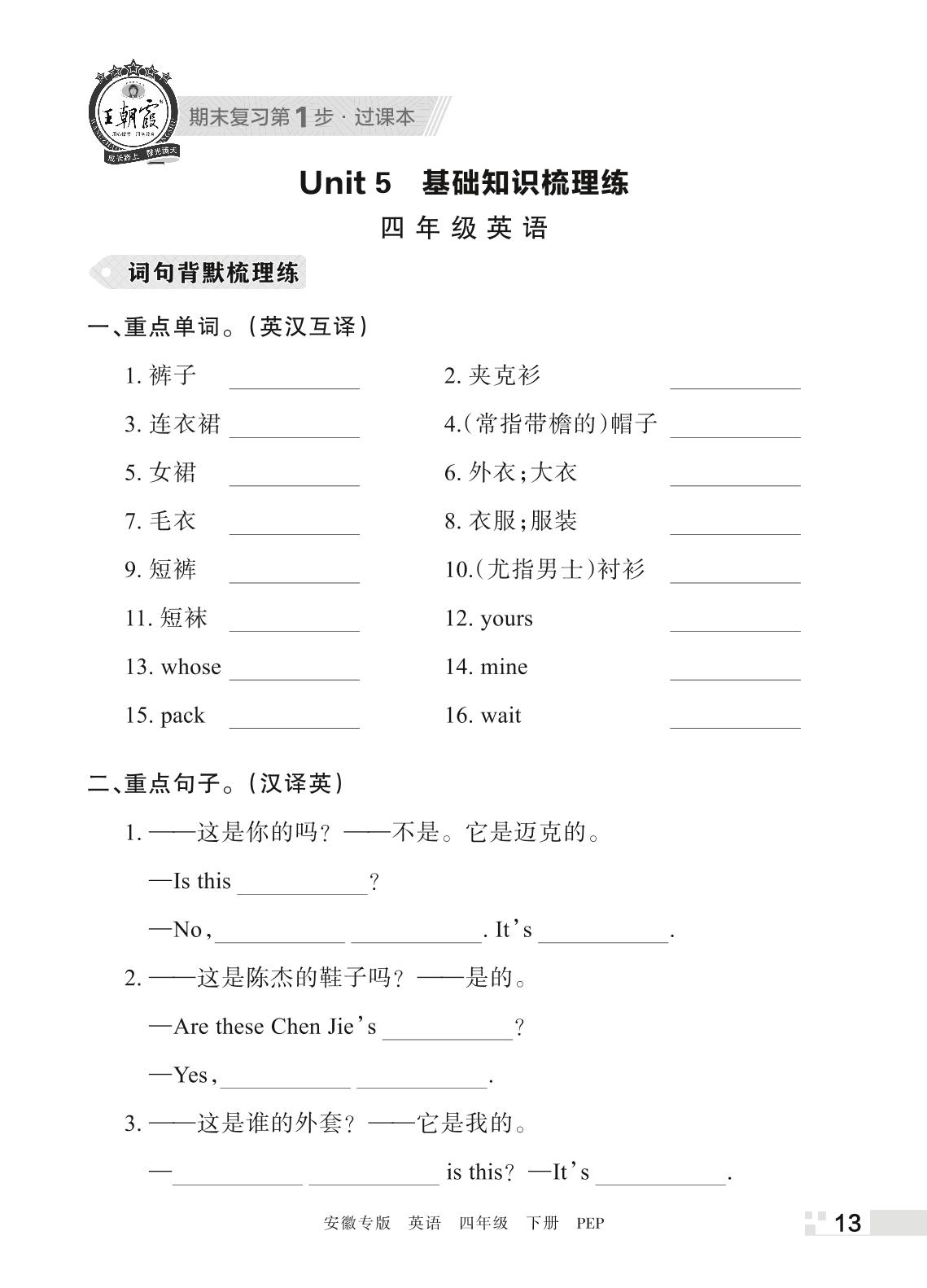 王朝霞期末过课本——Unit 5 基础知识梳理练四年级下册英语(PEP版)