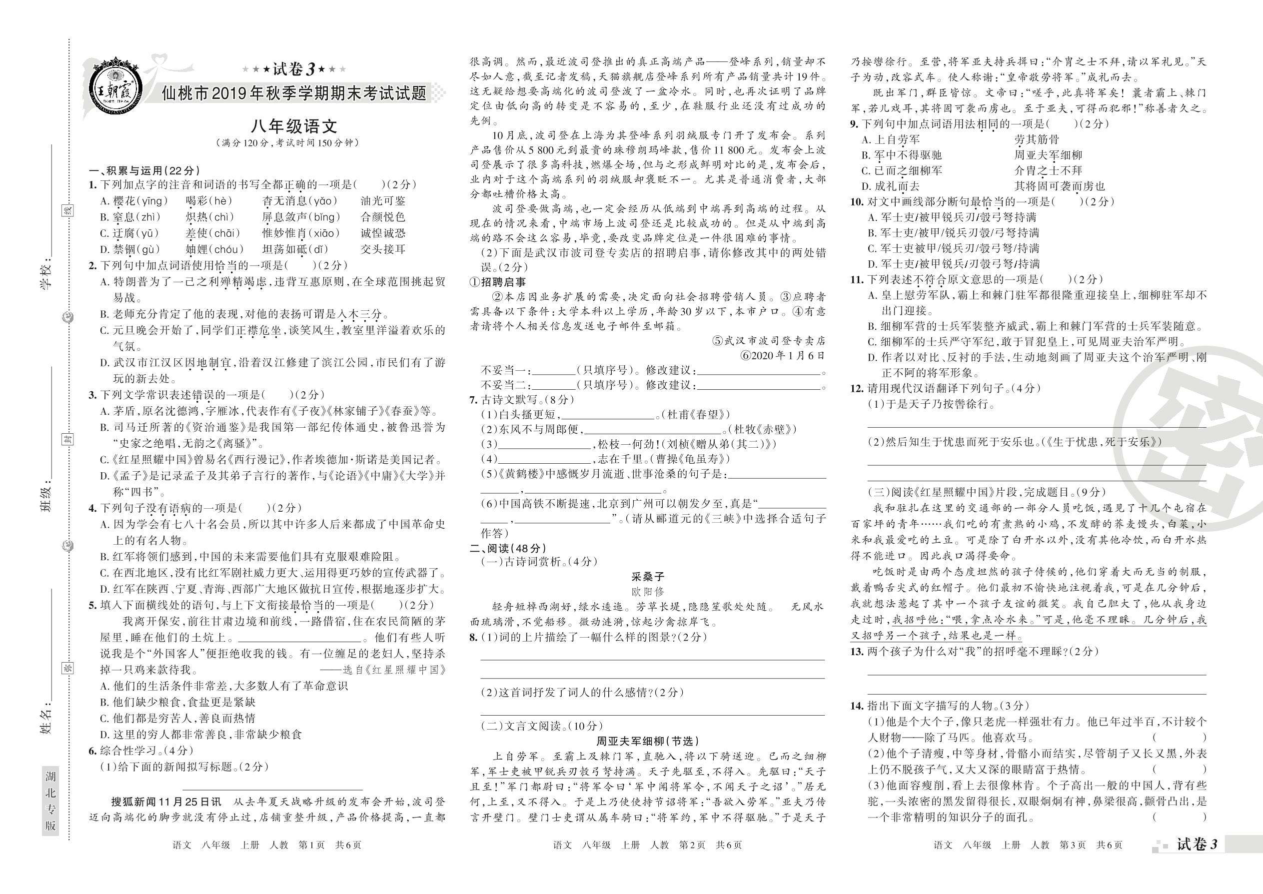 2019-2020学年第一学期仙桃市八年级语文试卷(人教版)【3】