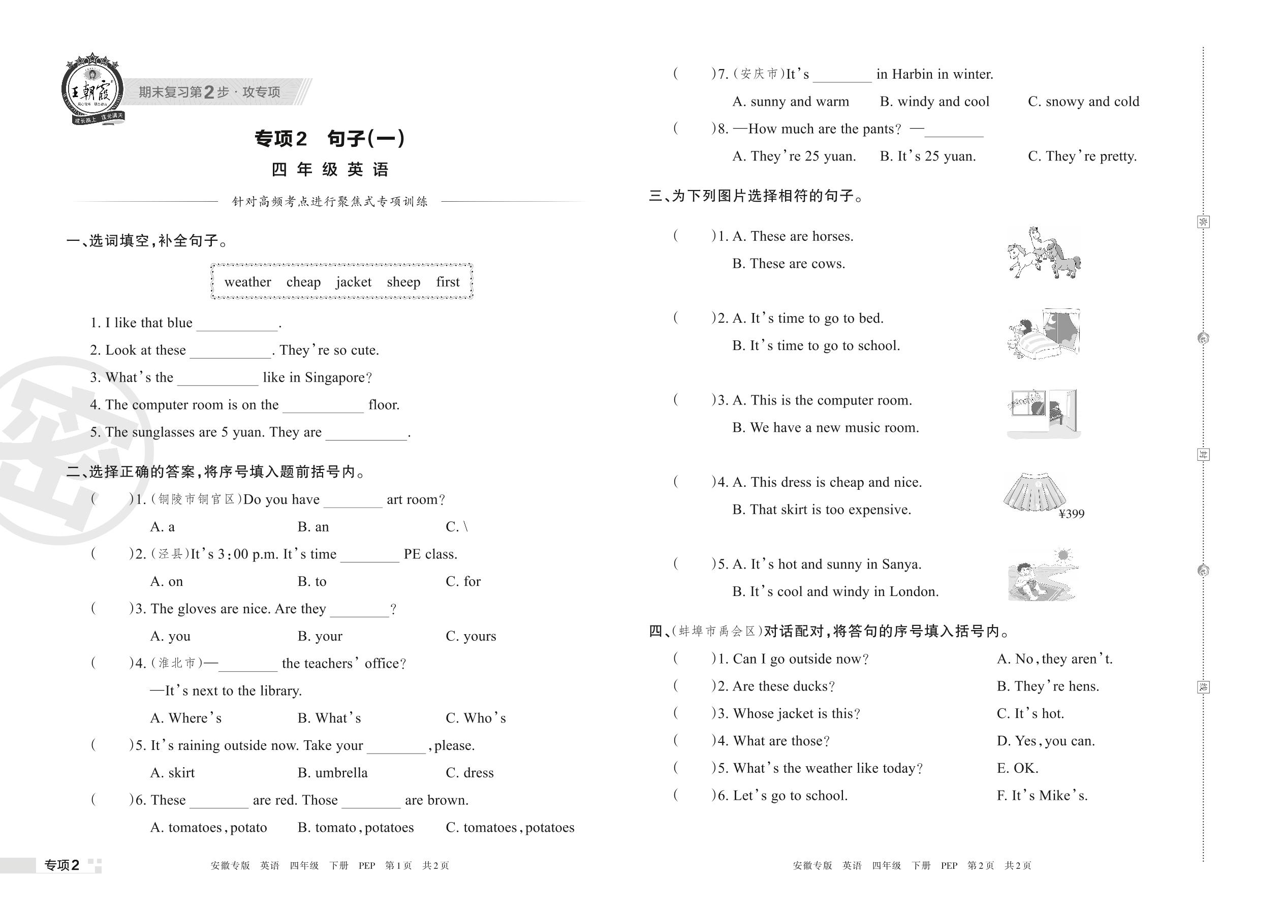 王朝霞期末专项卷——句子(一)四年级下册英语(PEP版)【2】