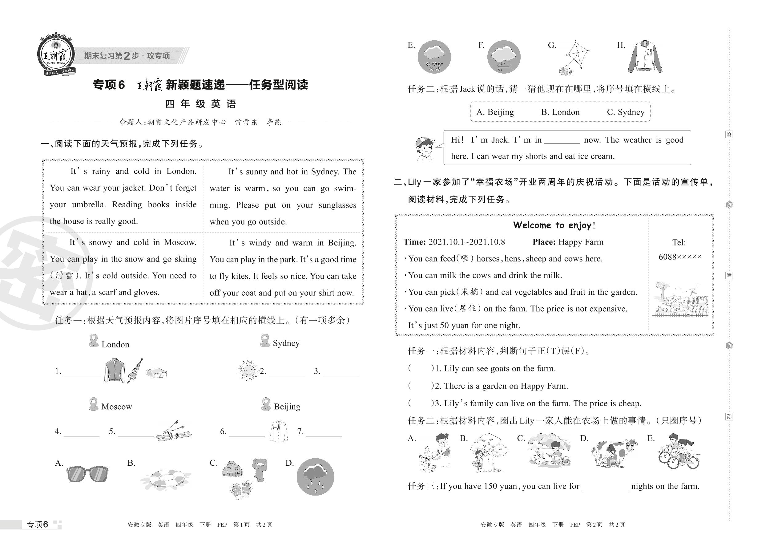 王朝霞期末专项卷——新颖题速递:任务型阅读四年级下册英语(PEP版)【6】