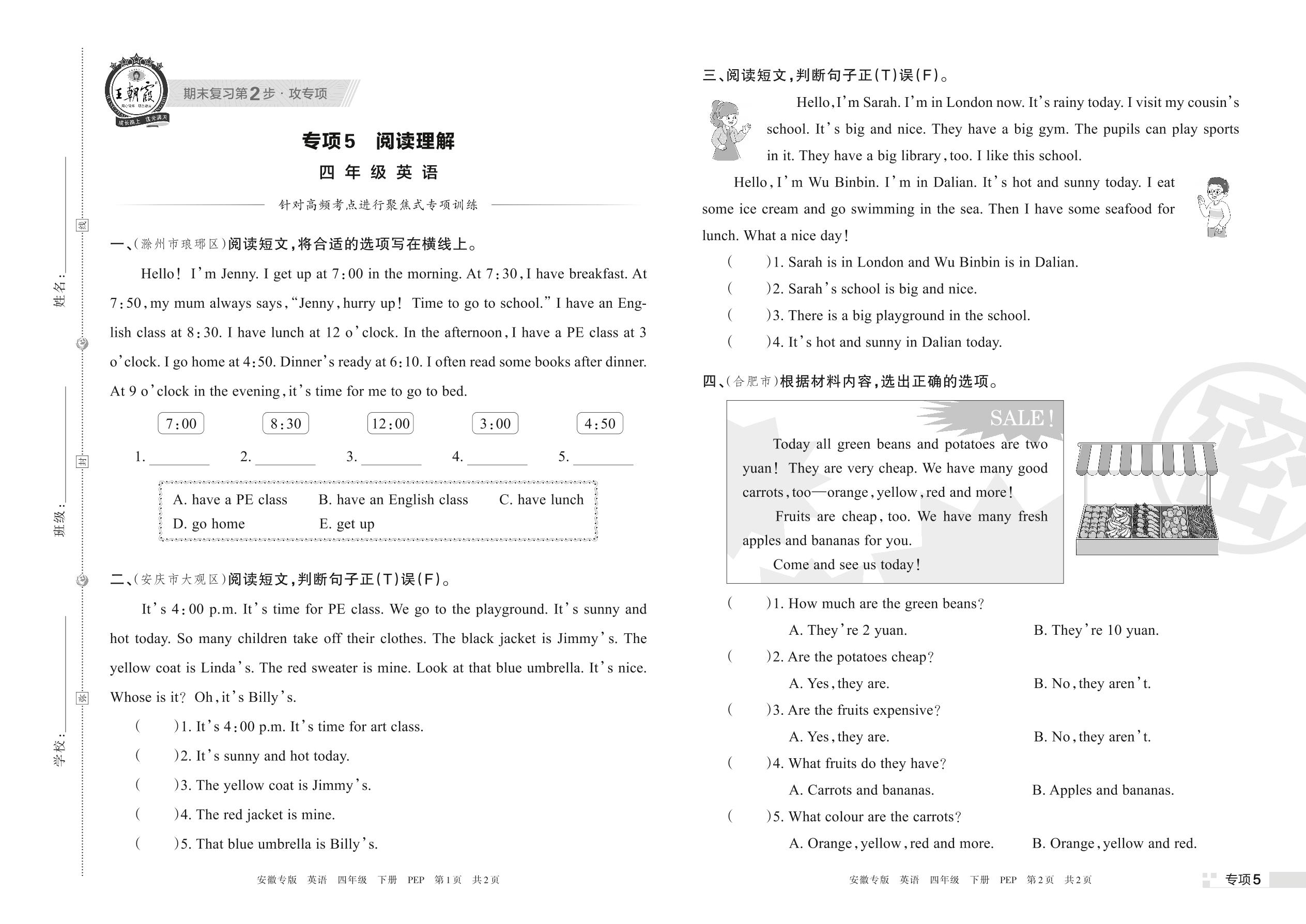 王朝霞期末专项卷——阅读理解四年级下册英语(PEP版)【5】