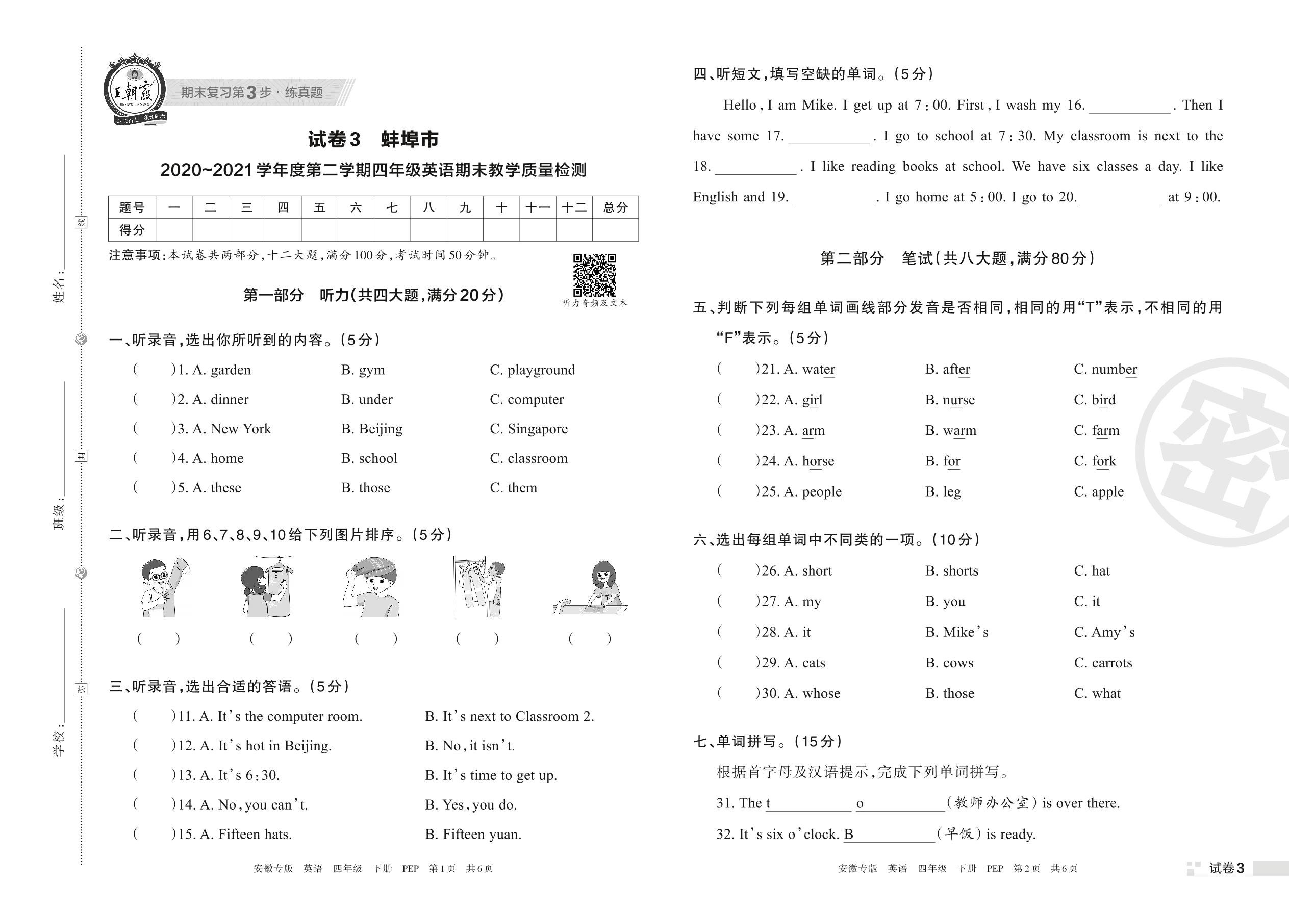 蚌埠市2020~2021学年度第二学期四年级英语期末教学质量检测(PEP版)【3】