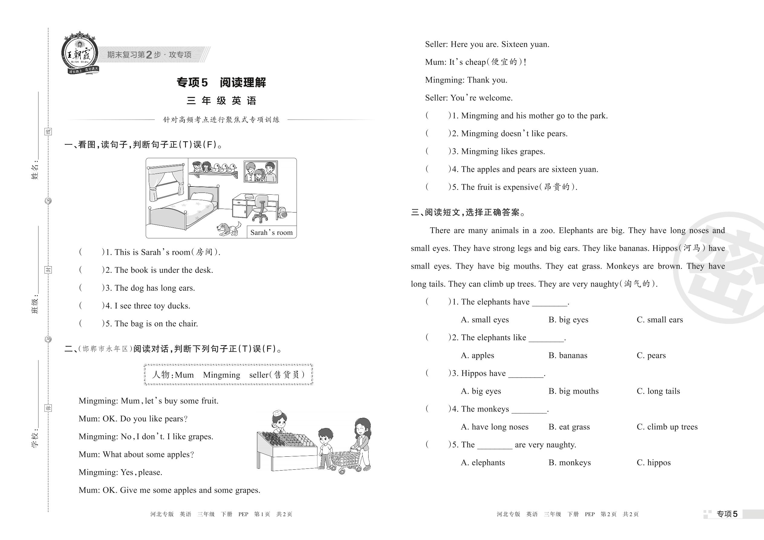 王朝霞期末专项卷——阅读理解三年级下册英语(PEP版)_R220328145711019【5】