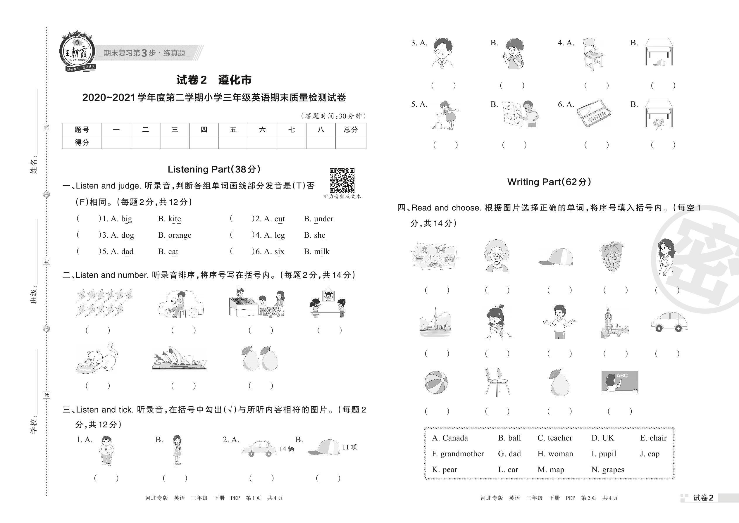 遵化市2020~2021学年度第二学期小学三年级英语期末质量检测试卷(PEP版)【2】
