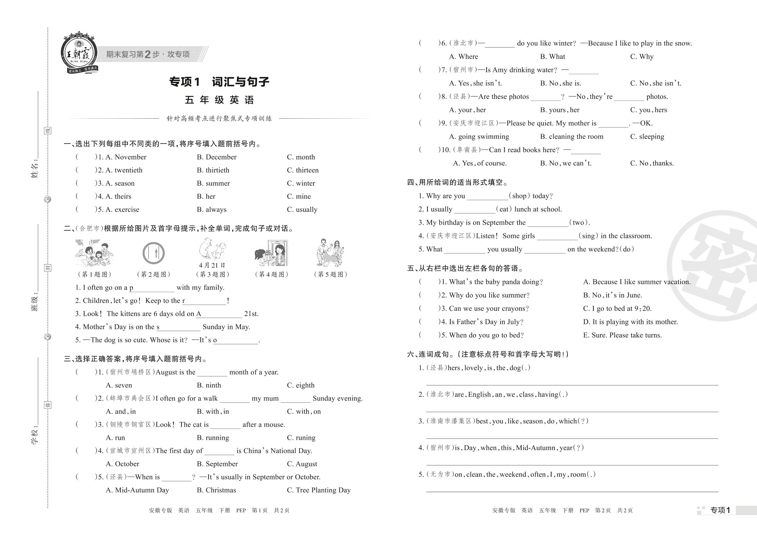 王朝霞期末专项卷——词汇与句子五年级下册英语(PEP版)【1】