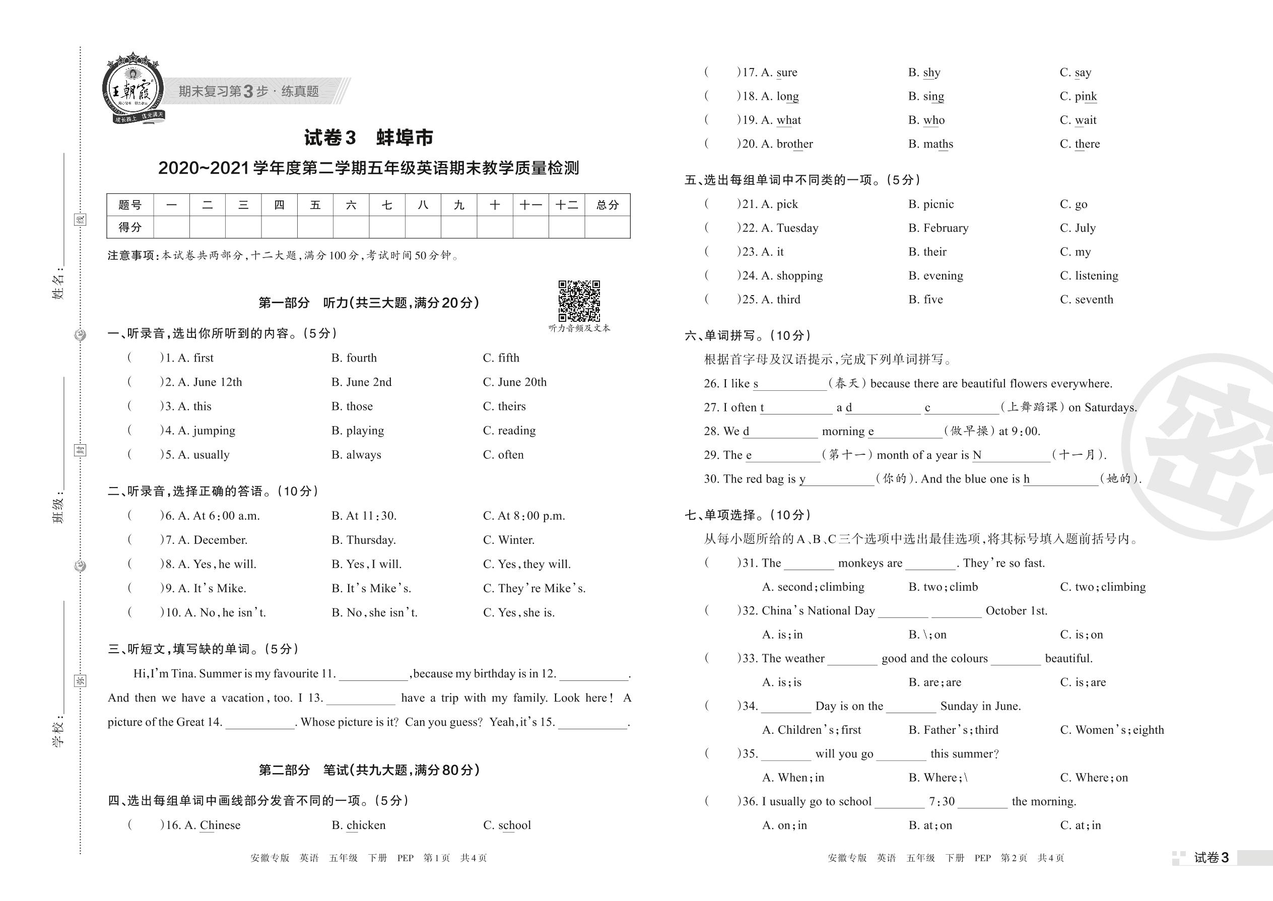 蚌埠市2020~2021学年度第二学期五年级英语期末教学质量检测(PEP版)【3】