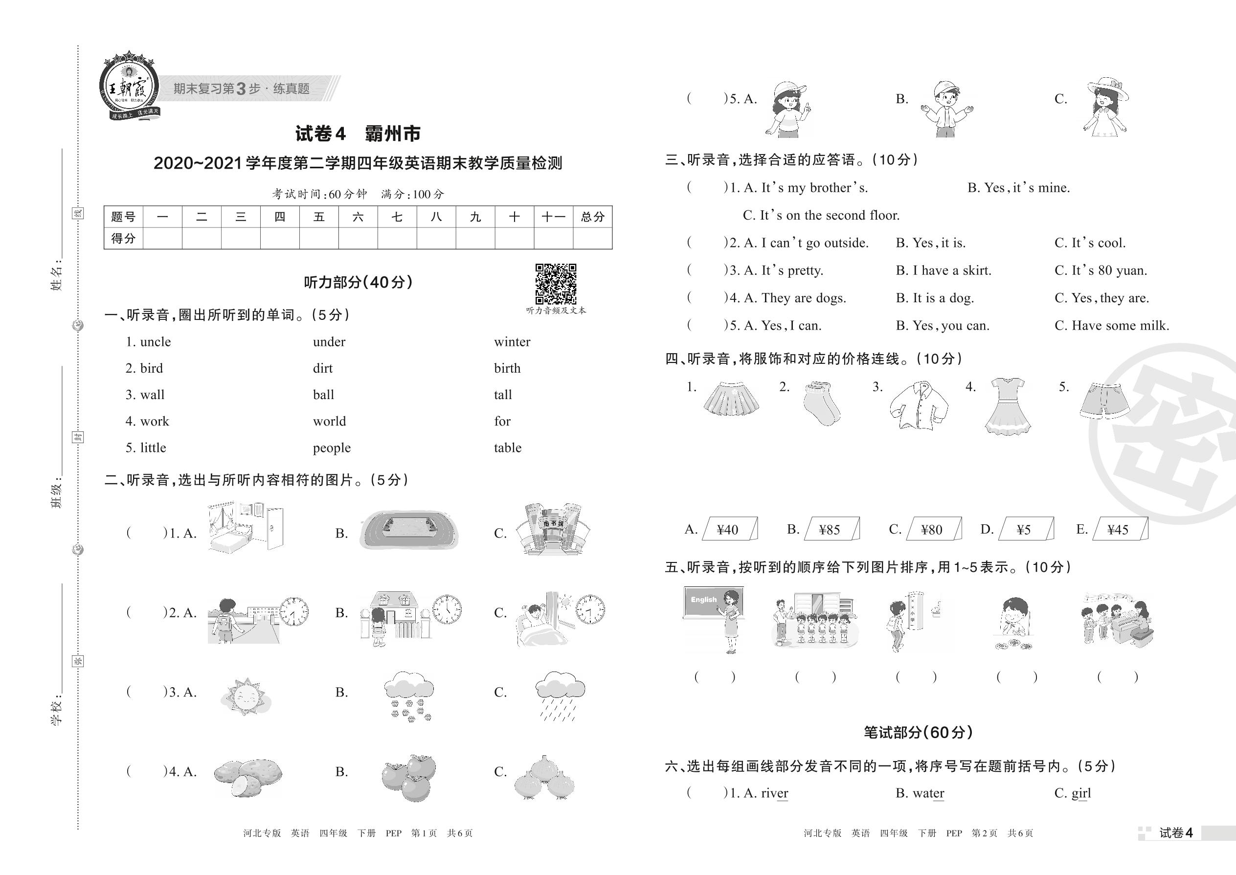 霸州市2020~2021学年度第二学期四年级英语期末教学质量检测(PEP版)【4】