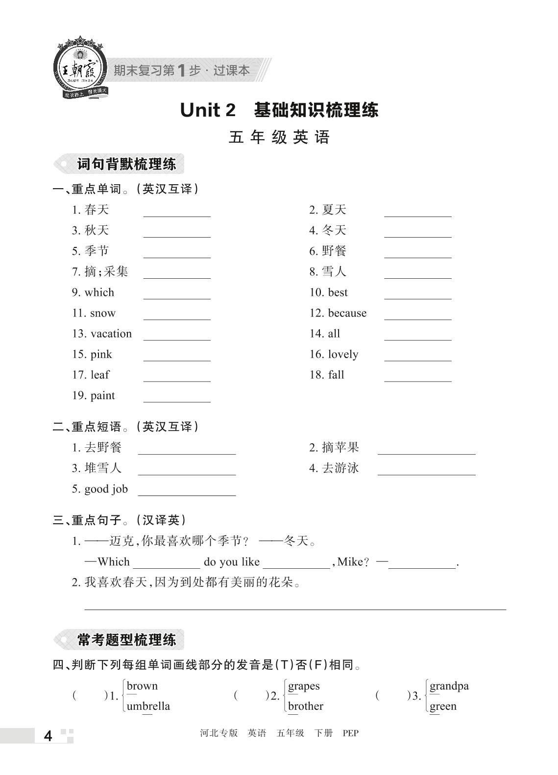 王朝霞期末过课本——Unit 2 基础知识梳理练五年级下册英语(PEP版)_R220328151008815