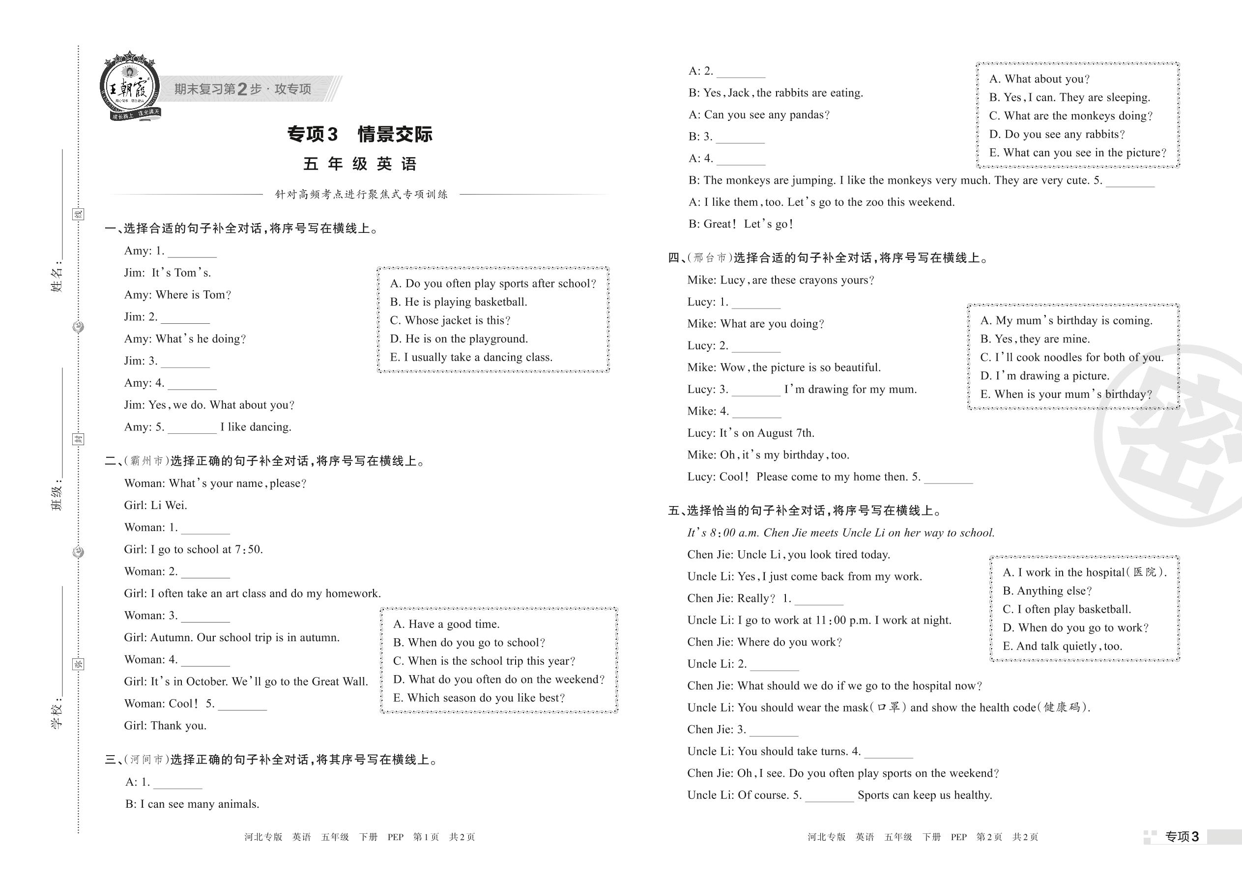 王朝霞期末专项卷——情景交际五年级下册英语(PEP版)【3】