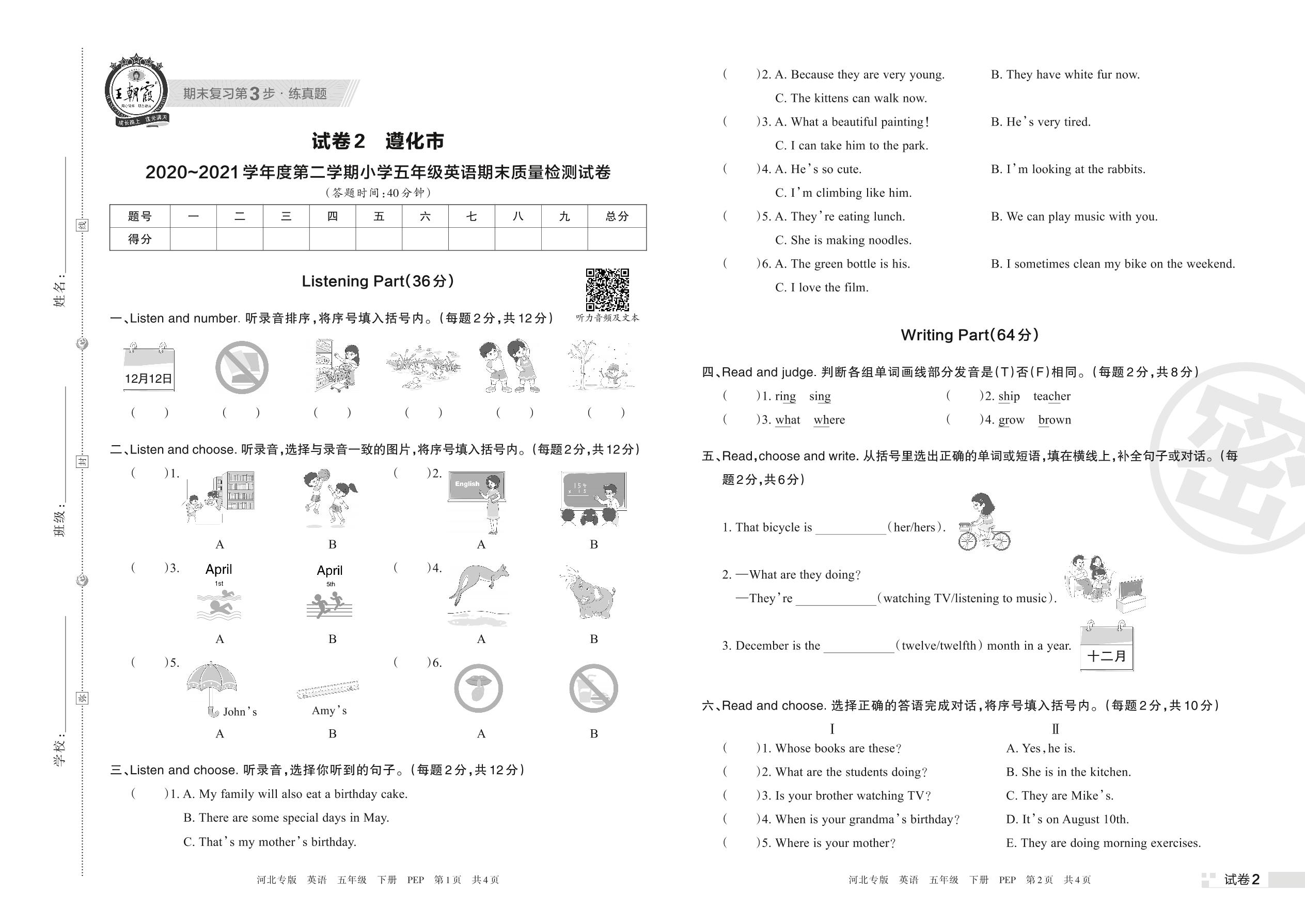 遵化市2020~2021学年度第二学期小学五年级英语期末质量检测试卷(PEP版)【2】