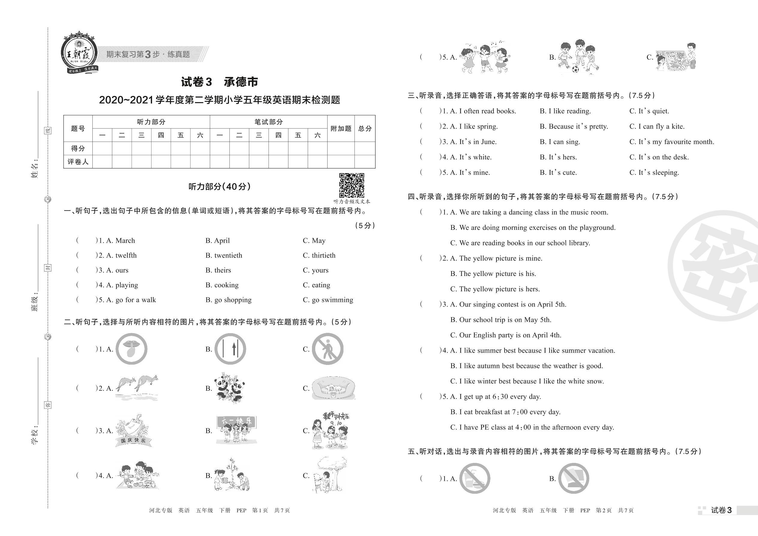 承德市2020~2021学年度第二学期小学五年级英语期末检测题(PEP版)【3】