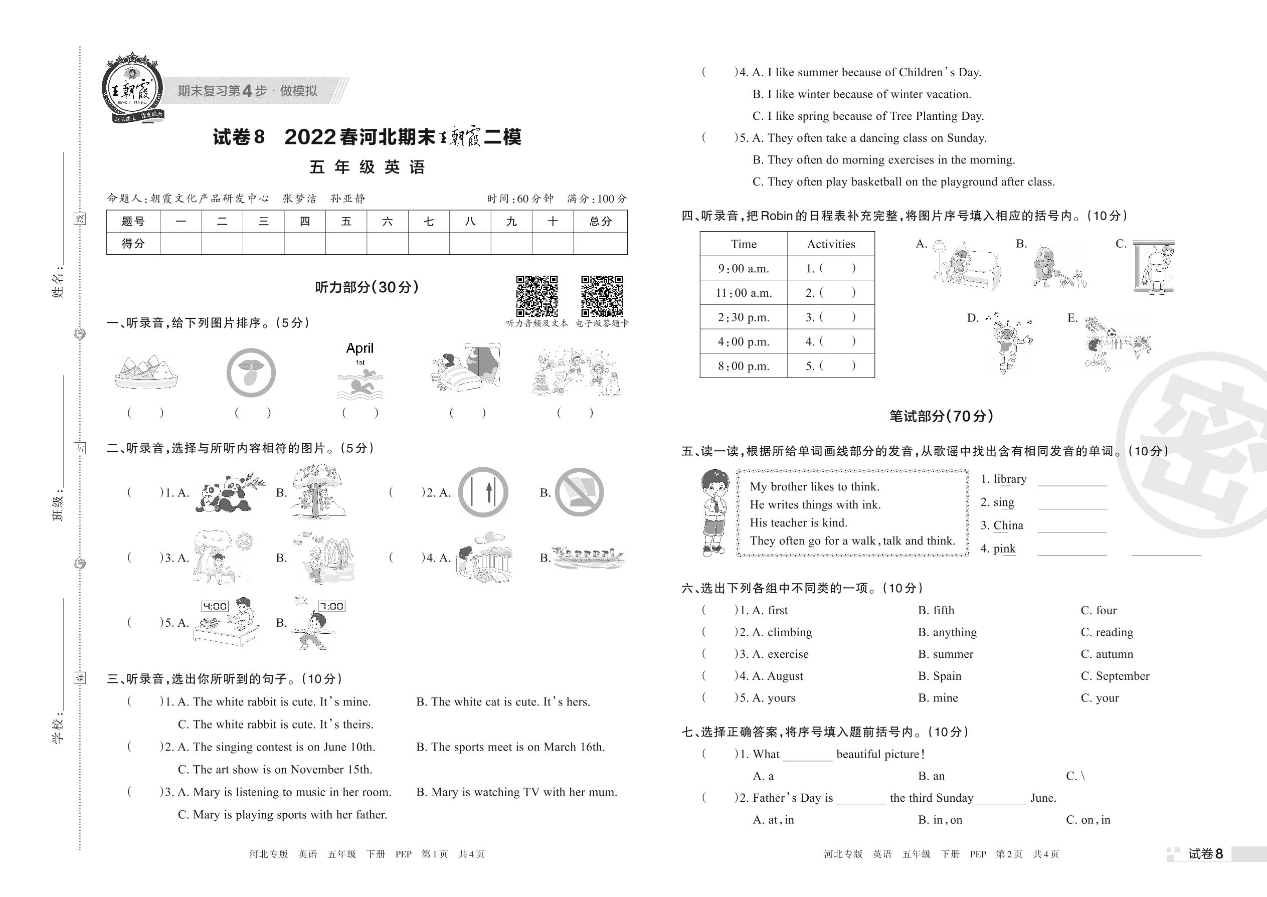 王朝霞期末模拟卷五年级下册英语(PEP版)_R220328151010978【8】