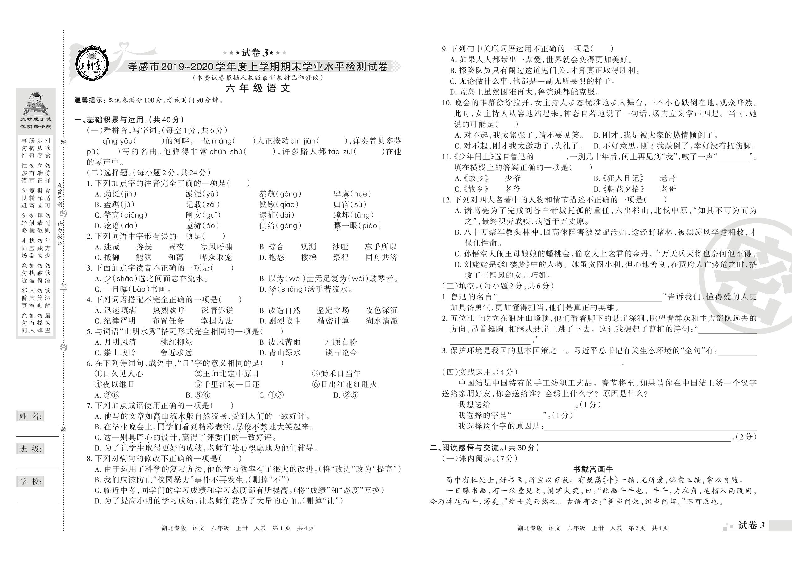 2019-2020学年第一学期孝感市六年级语文试卷(人教版)【3】