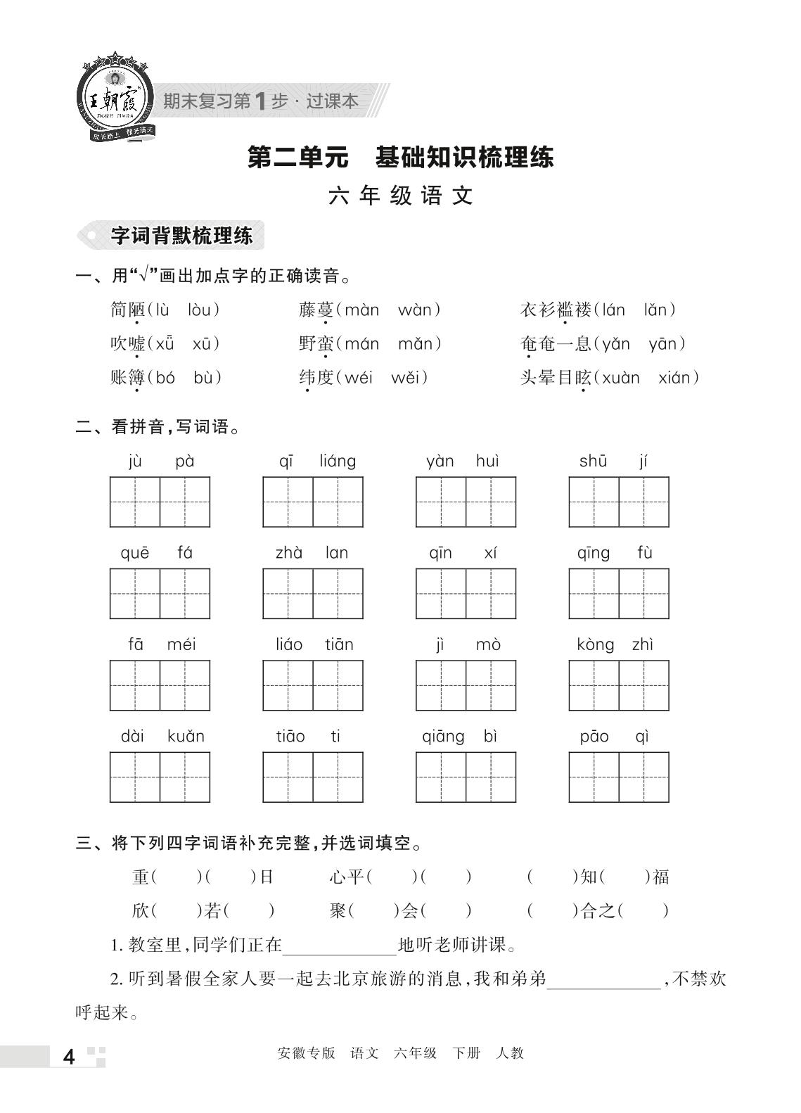王朝霞期末过课本——第二单元 基础知识梳理练六年级下册语文(人教版)