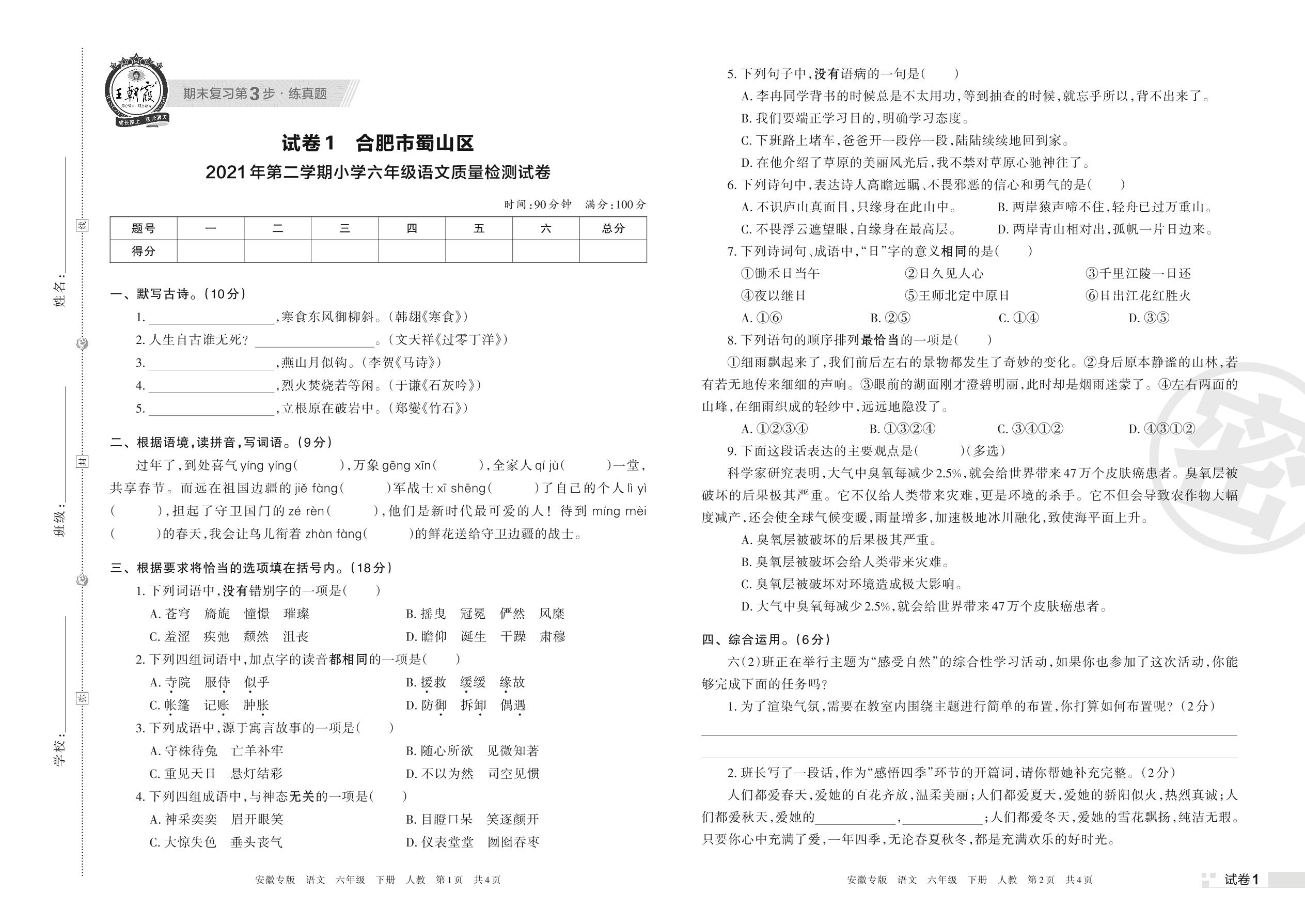 合肥市蜀山区2021年第二学期小学六年级语文质量检测试卷(人教版)【1】
