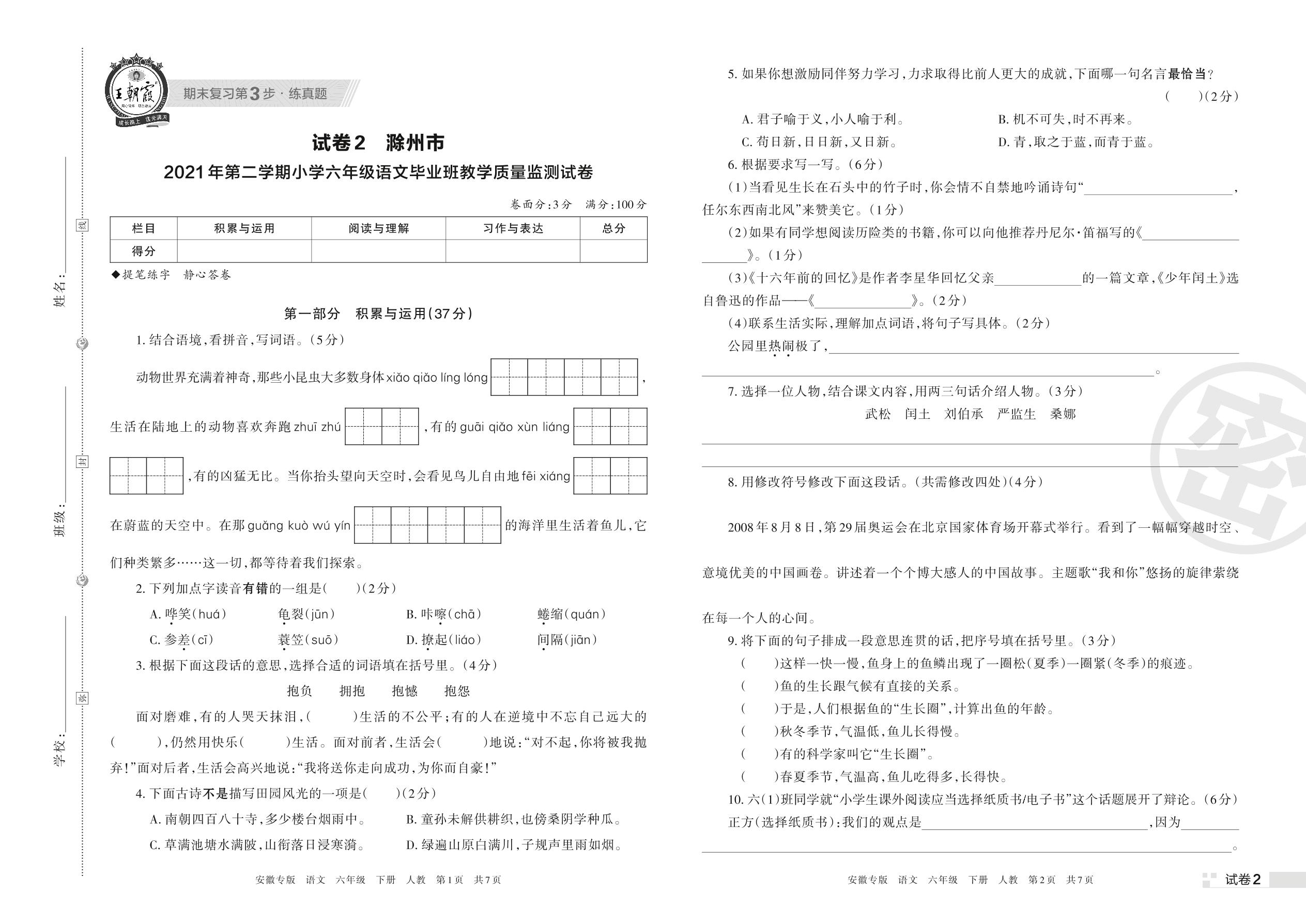 滁州市2021年第二学期小学六年级语文毕业班教学质量监测试卷(人教版)【2】