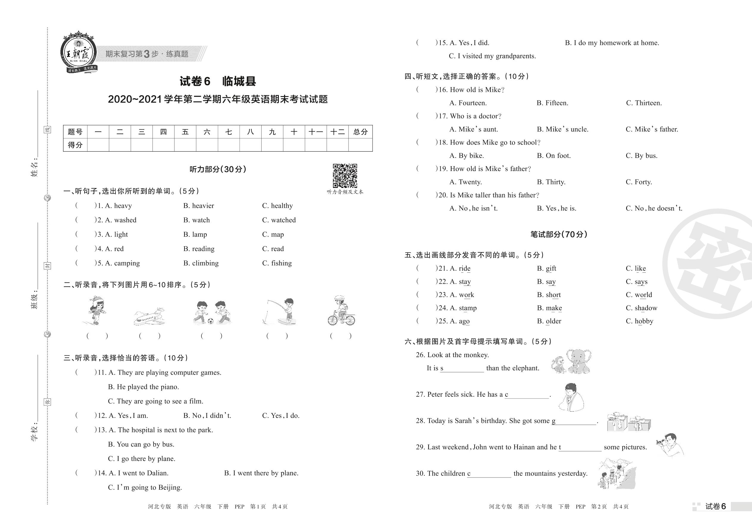 临城县2020~2021学年第二学期六年级英语期末考试试题(PEP版)【6】