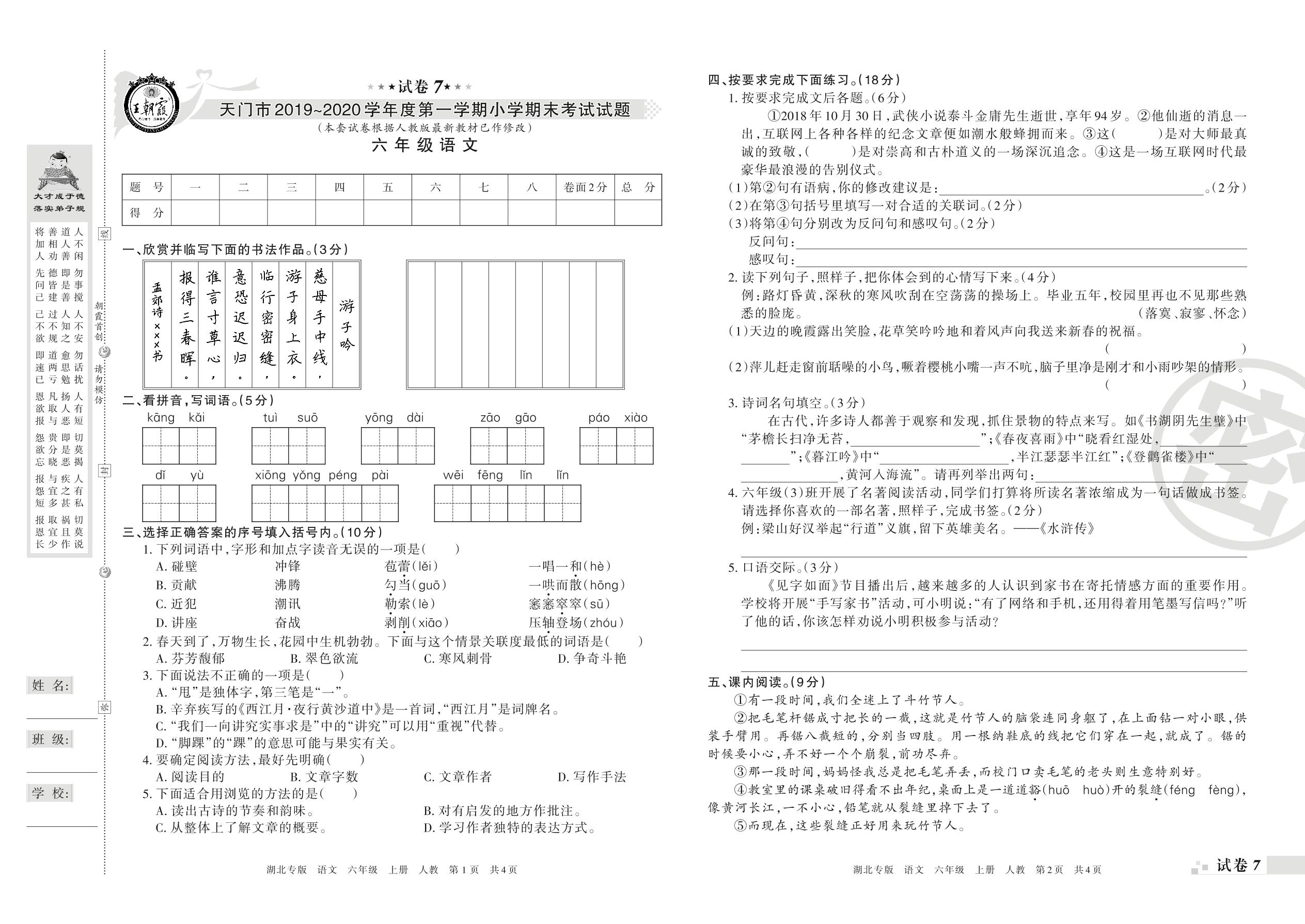 2019-2020学年第一学期天门市六年级语文试卷(人教版)【7】