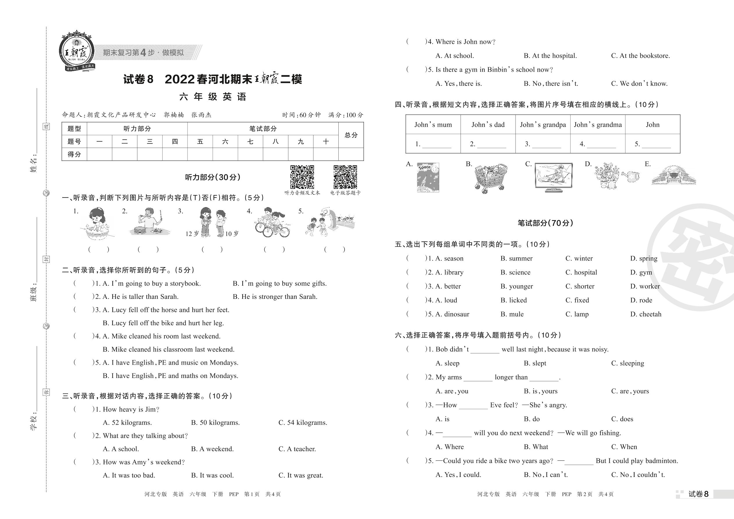 王朝霞期末模拟卷六年级下册英语(PEP版)【8】