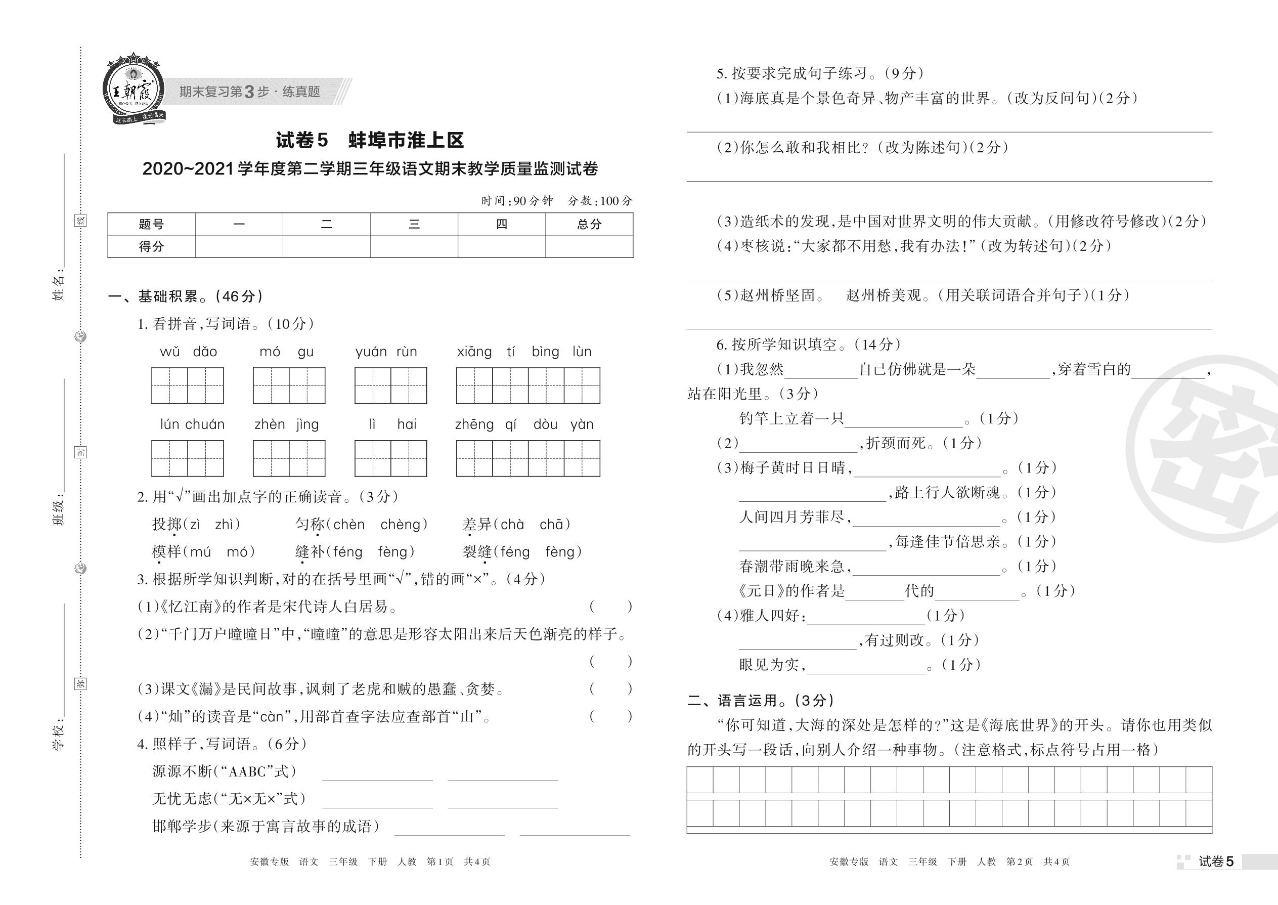 蚌埠市淮上区2020~2021学年度第二学期三年级语文期末教学质量监测试卷(人教版)【5】