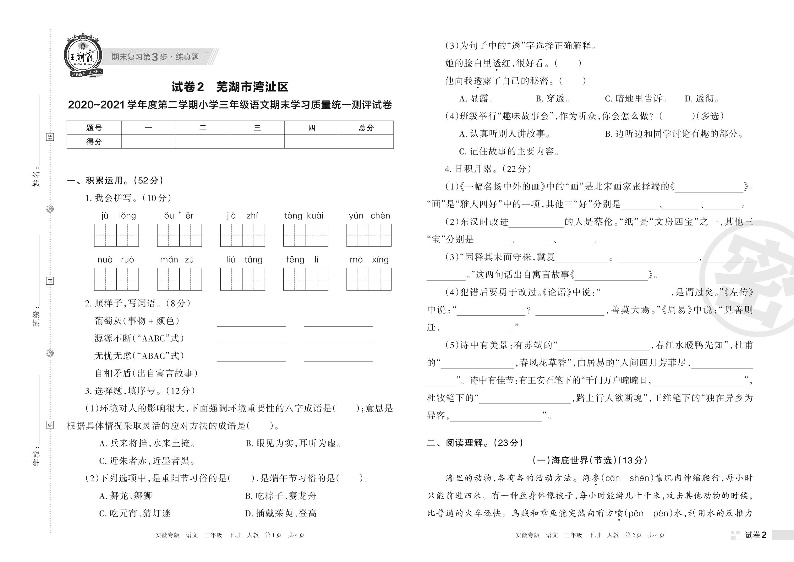 芜湖市湾沚区2020~2021学年度第二学期小学三年级语文期末学习质量统一测评试卷(人教版)【2】