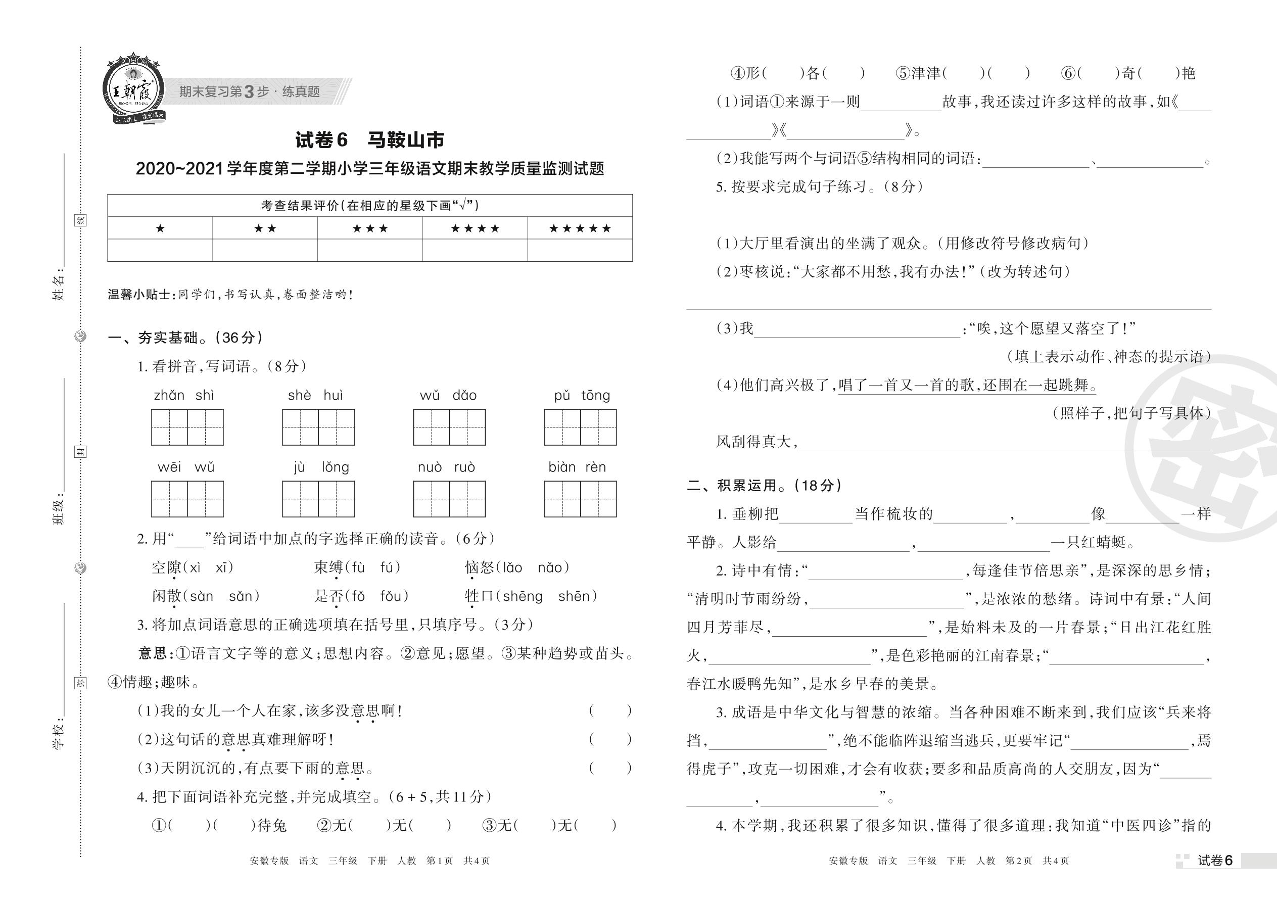 马鞍山市2020~2021学年度第二学期小学三年级语文期末教学质量监测试题(人教版)【6】