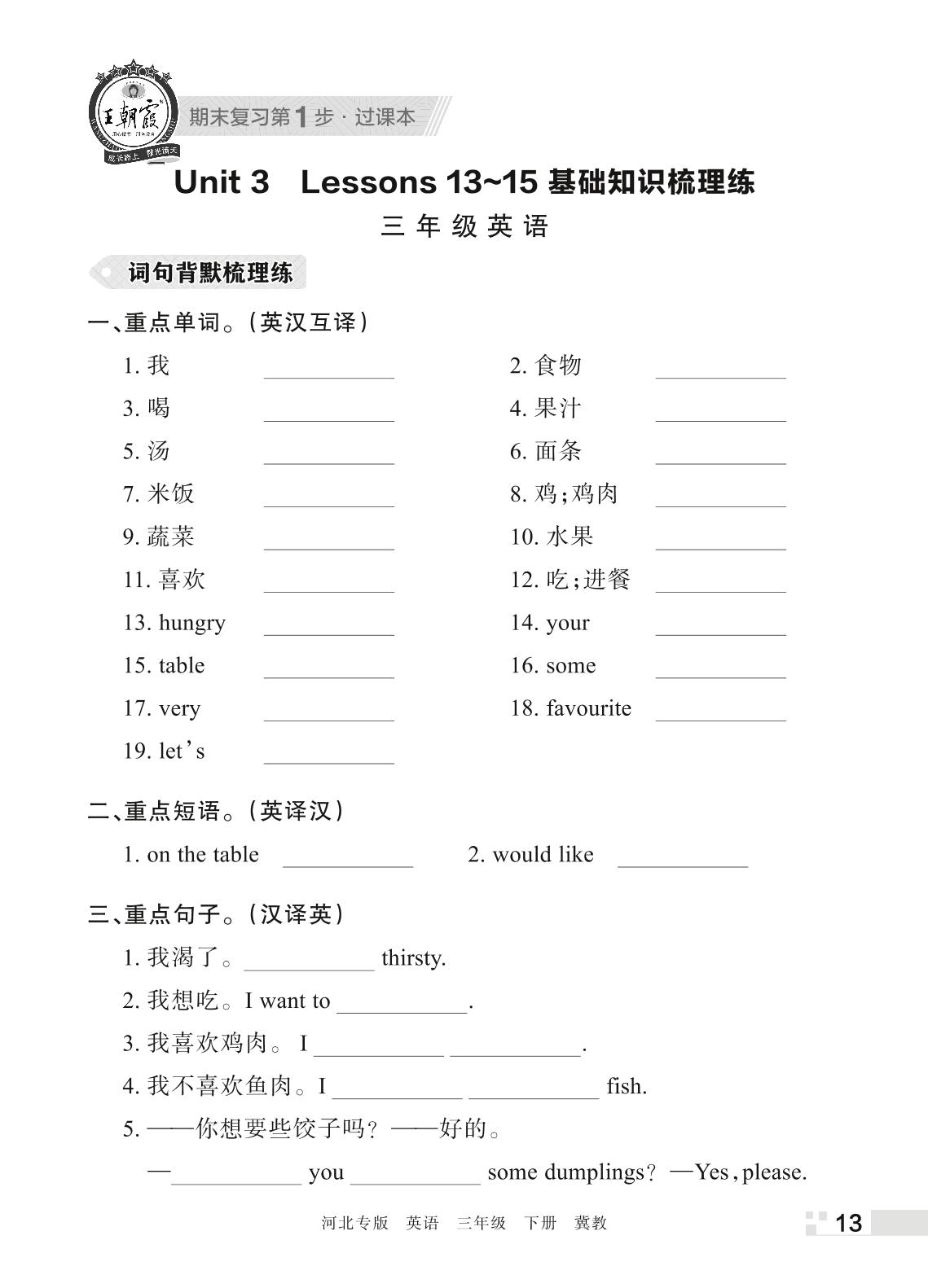 王朝霞期末过课本——Unit 3 Lessons 13~15基础知识梳理练三年级下册英语(冀教版)