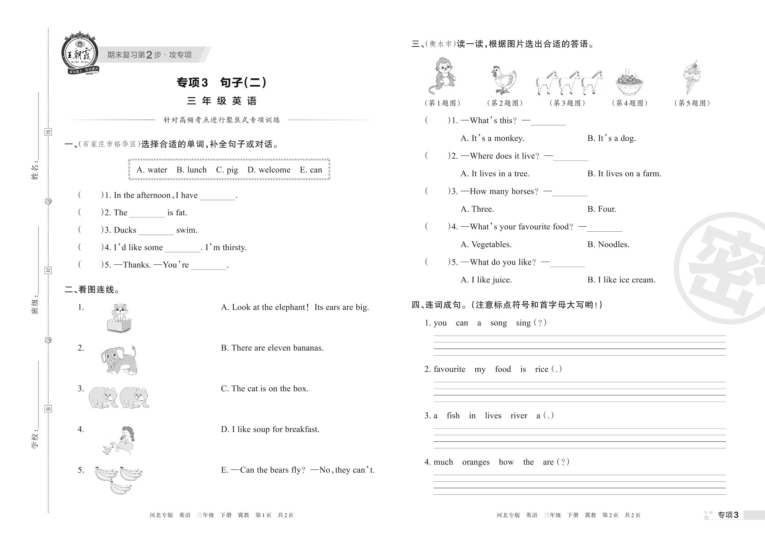 王朝霞期末专项卷——句子(二)三年级下册英语(冀教版)【3】