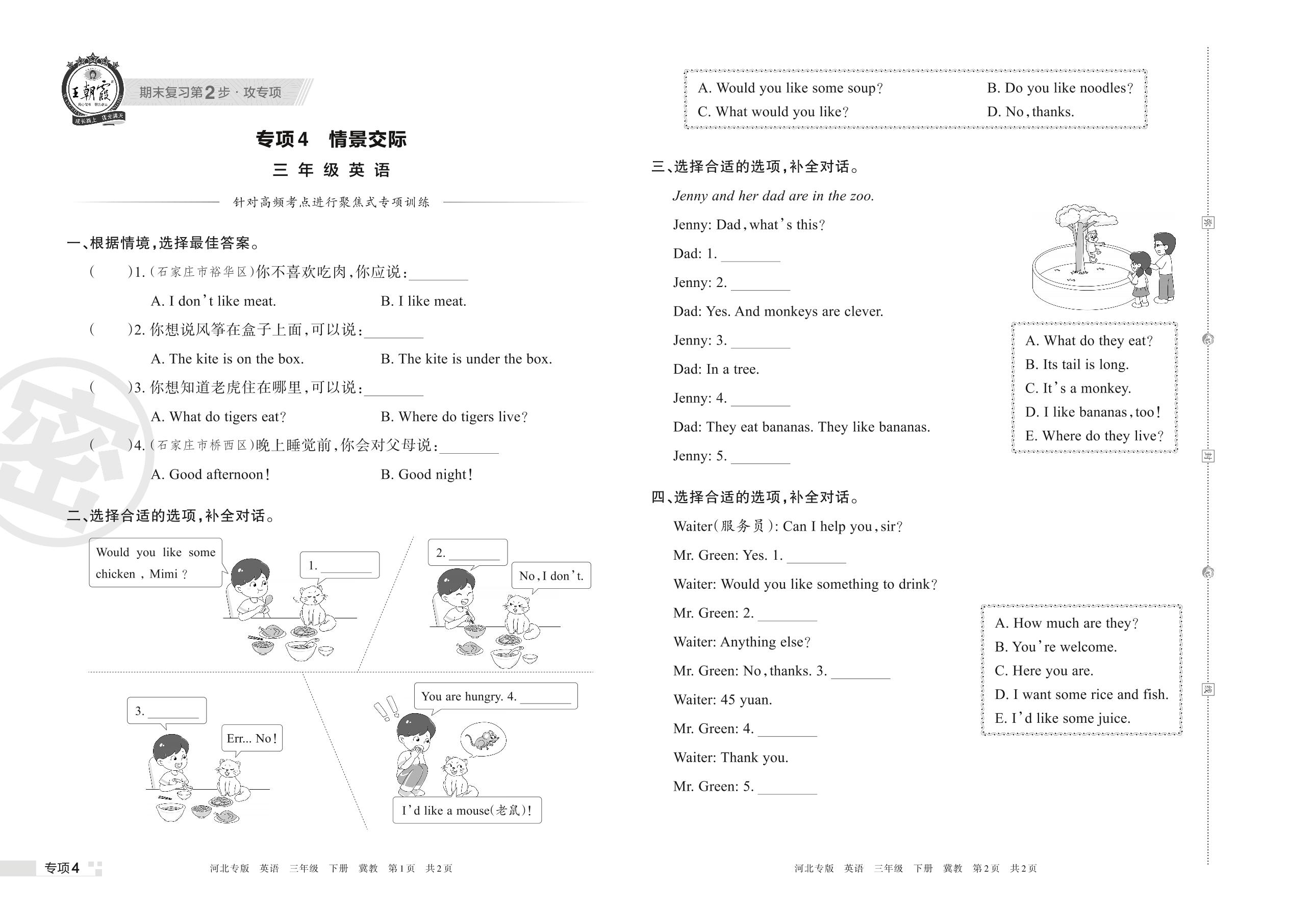 王朝霞期末专项卷——情景交际三年级下册英语(冀教版)【4】