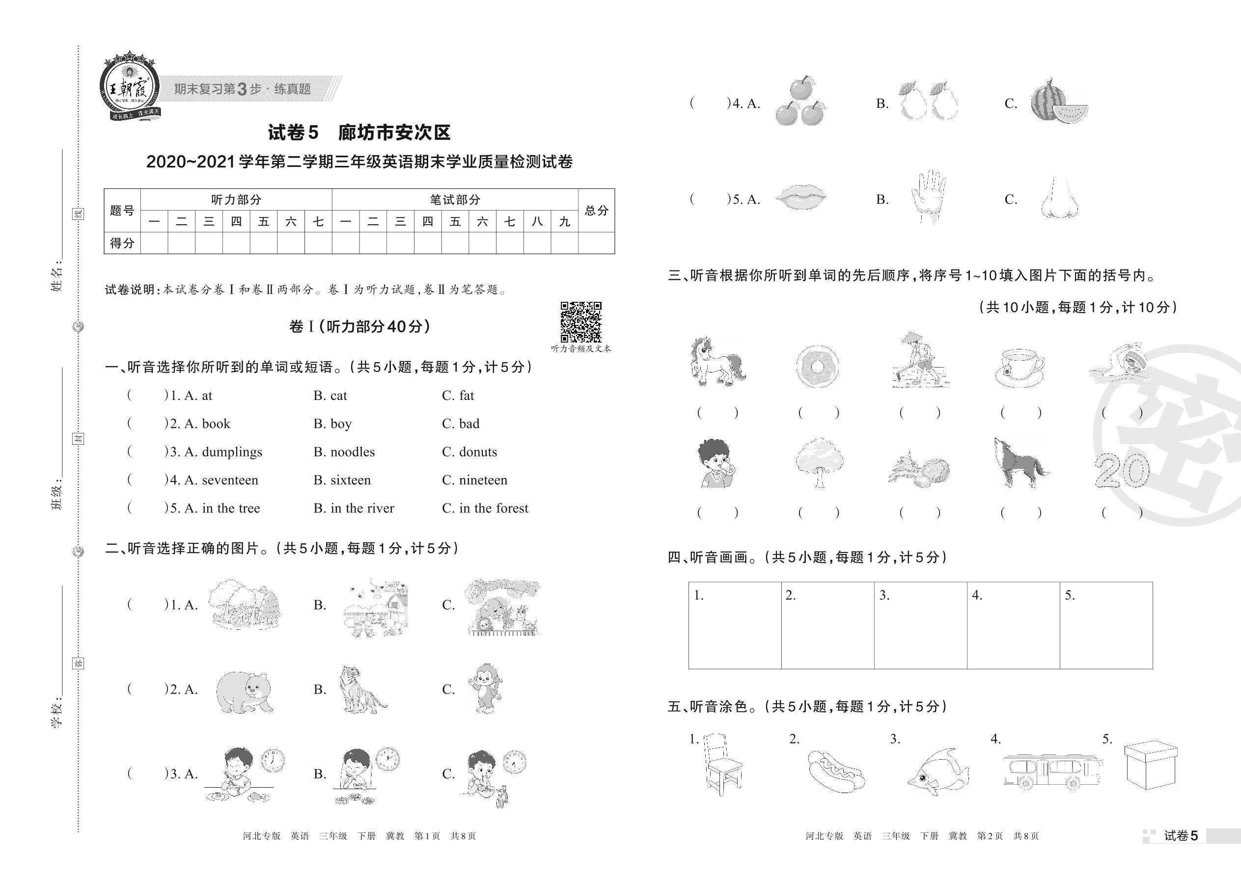 廊坊市安次区2020~2021学年第二学期三年级英语期末学业质量检测试卷(冀教版)【5】