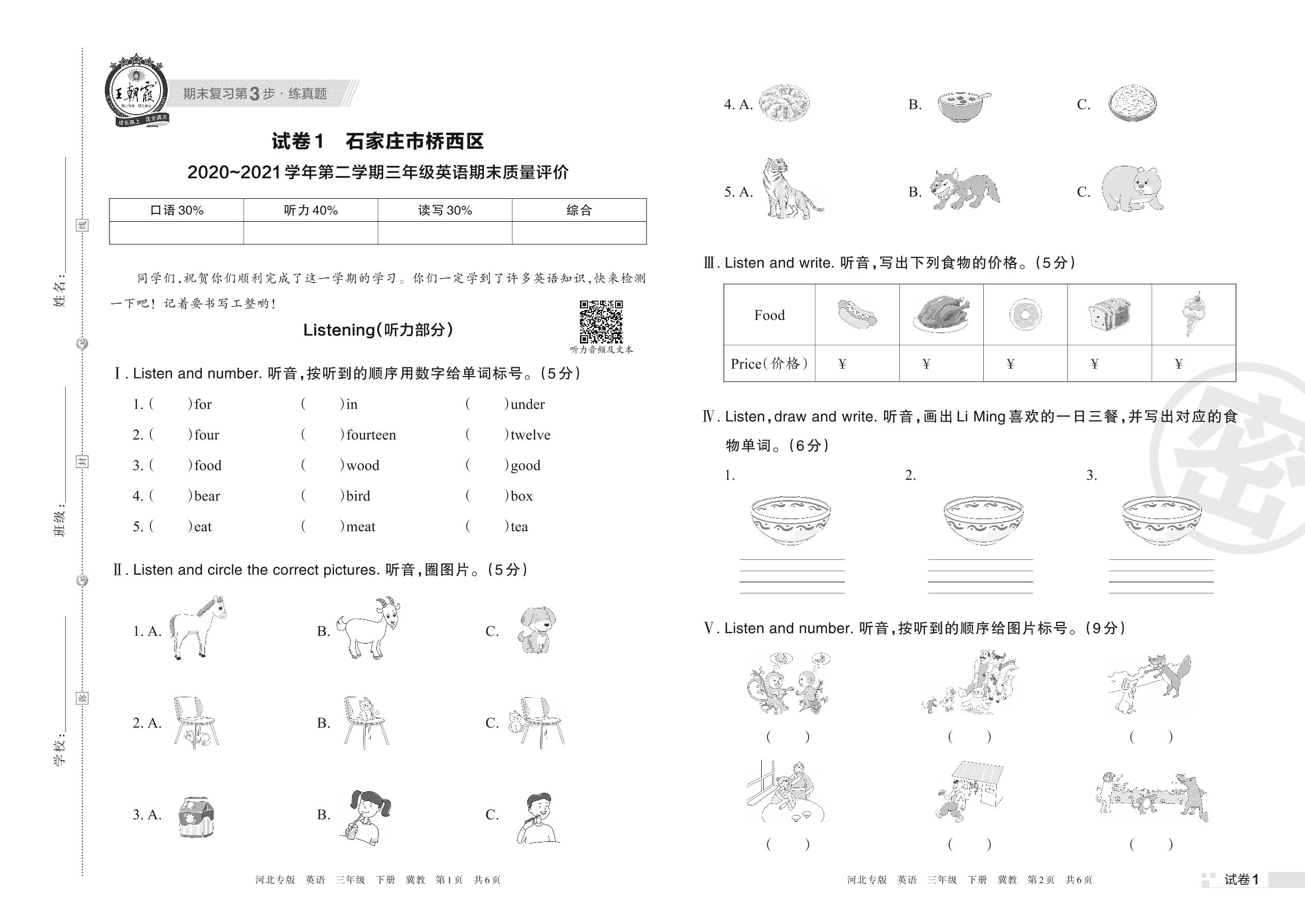 石家庄市桥西区2020~2021学年第二学期三年级英语期末质量评价(冀教版)【1】