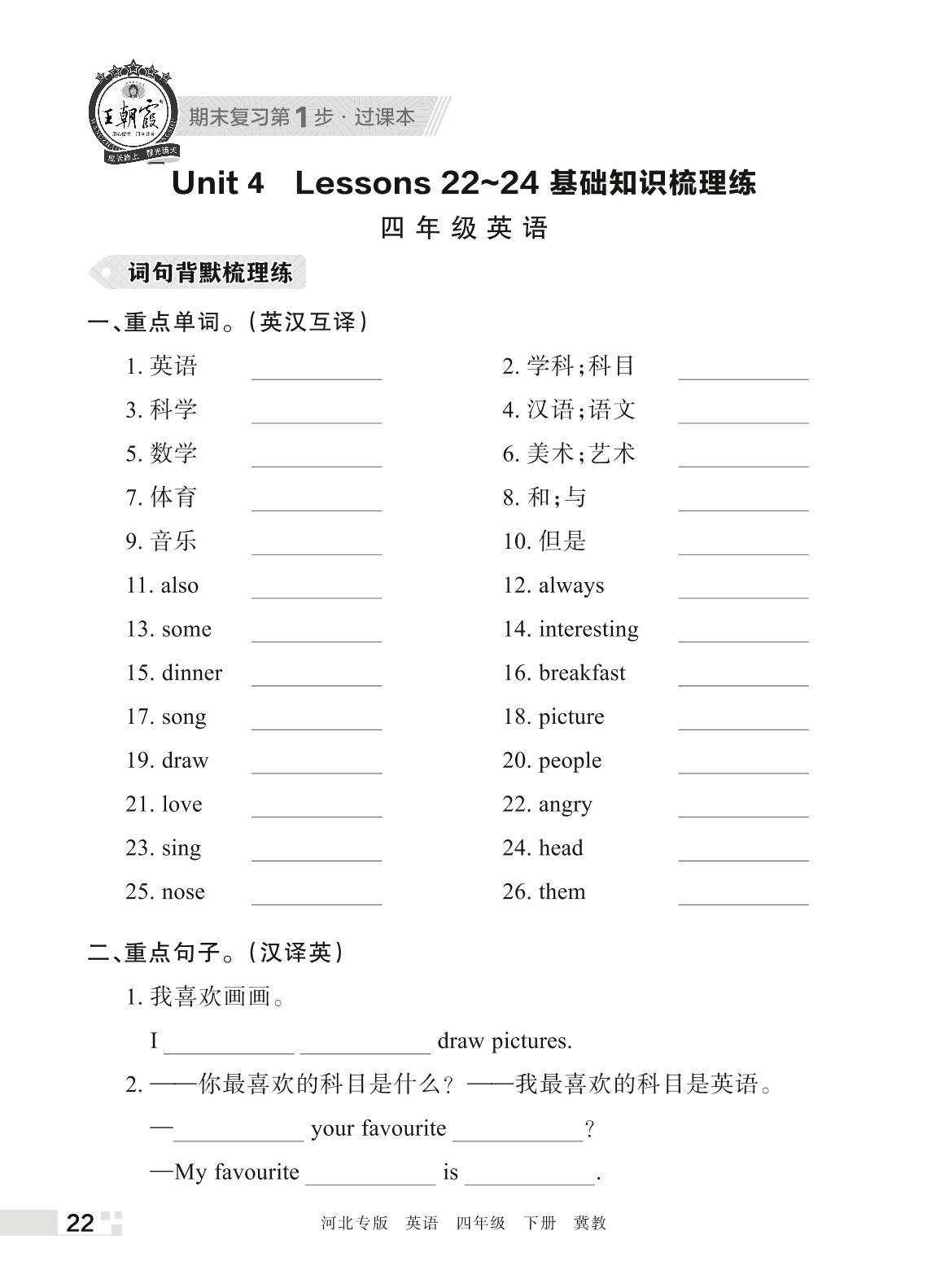 王朝霞期末过课本——Unit 4 Lessons 22~24基础知识梳理练四年级下册英语(冀教版)