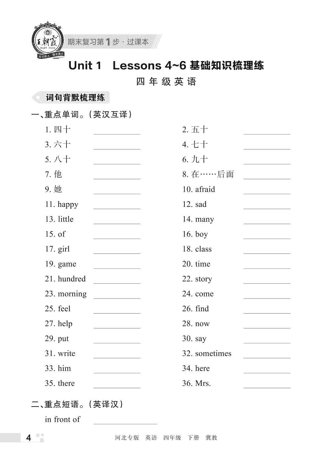 王朝霞期末过课本——Unit 1 Lessons 4~6基础知识梳理练四年级下册英语(冀教版)