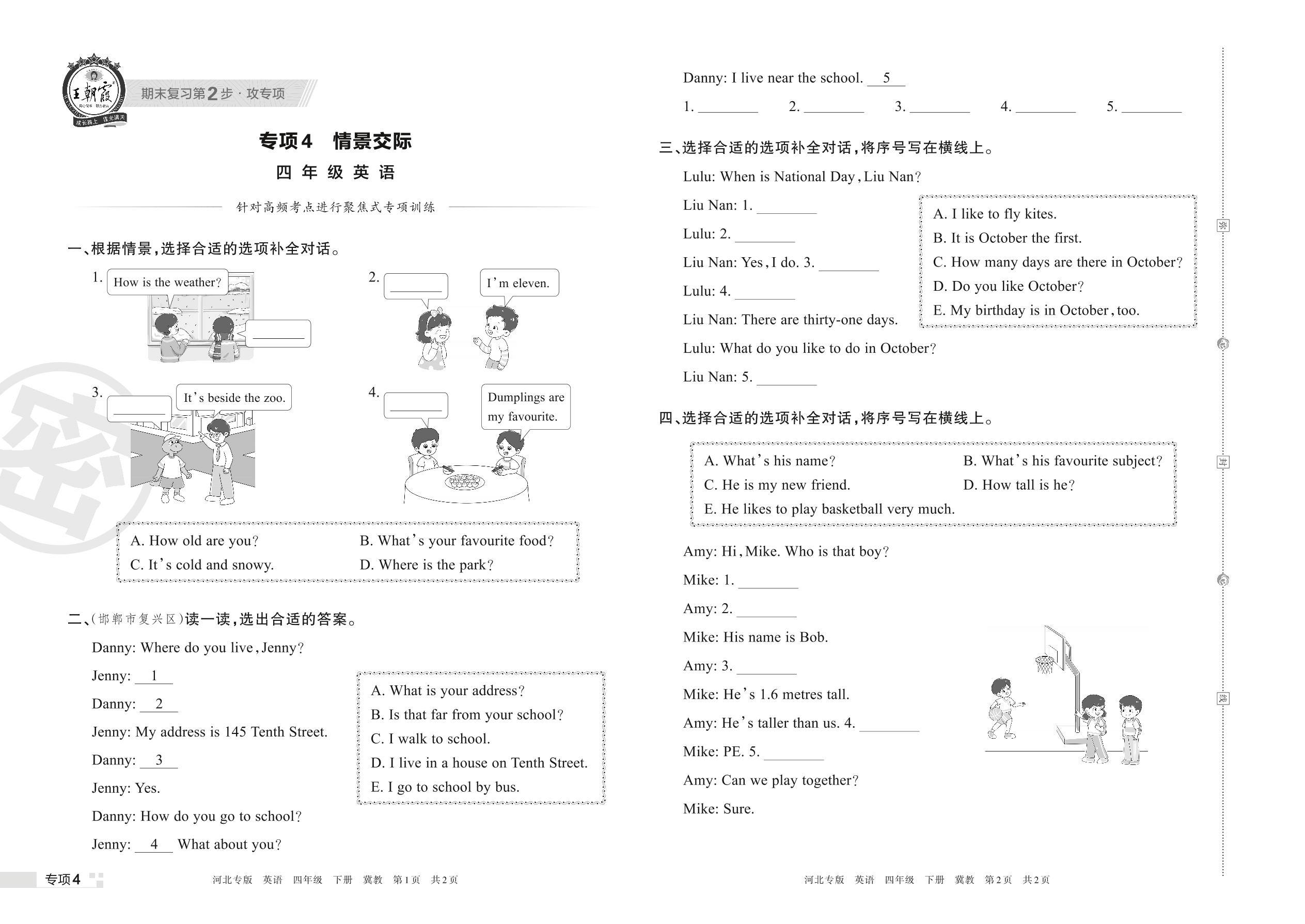 王朝霞期末专项卷——情景交际四年级下册英语(冀教版)【4】