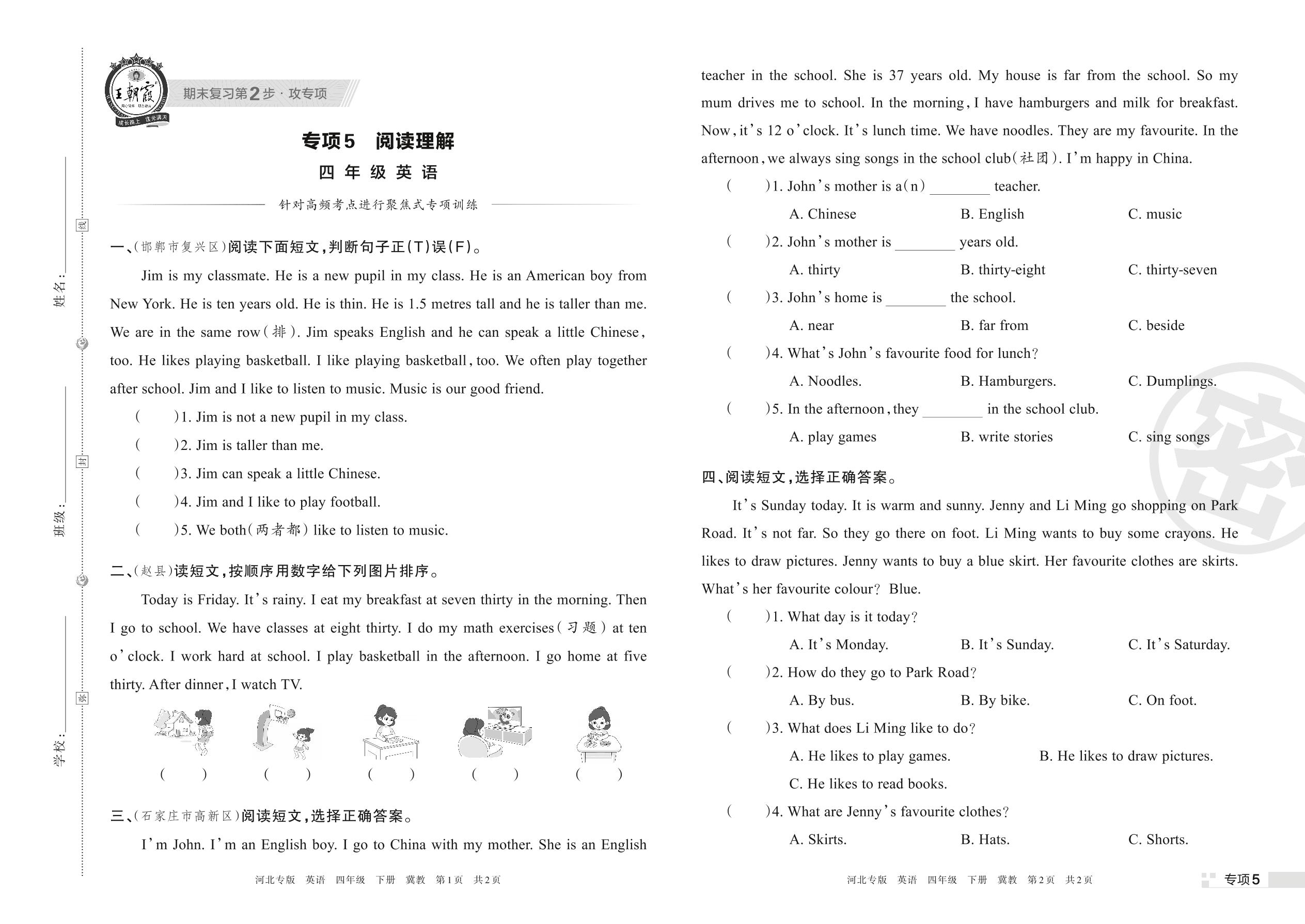 王朝霞期末专项卷——阅读理解四年级下册英语(冀教版)【5】
