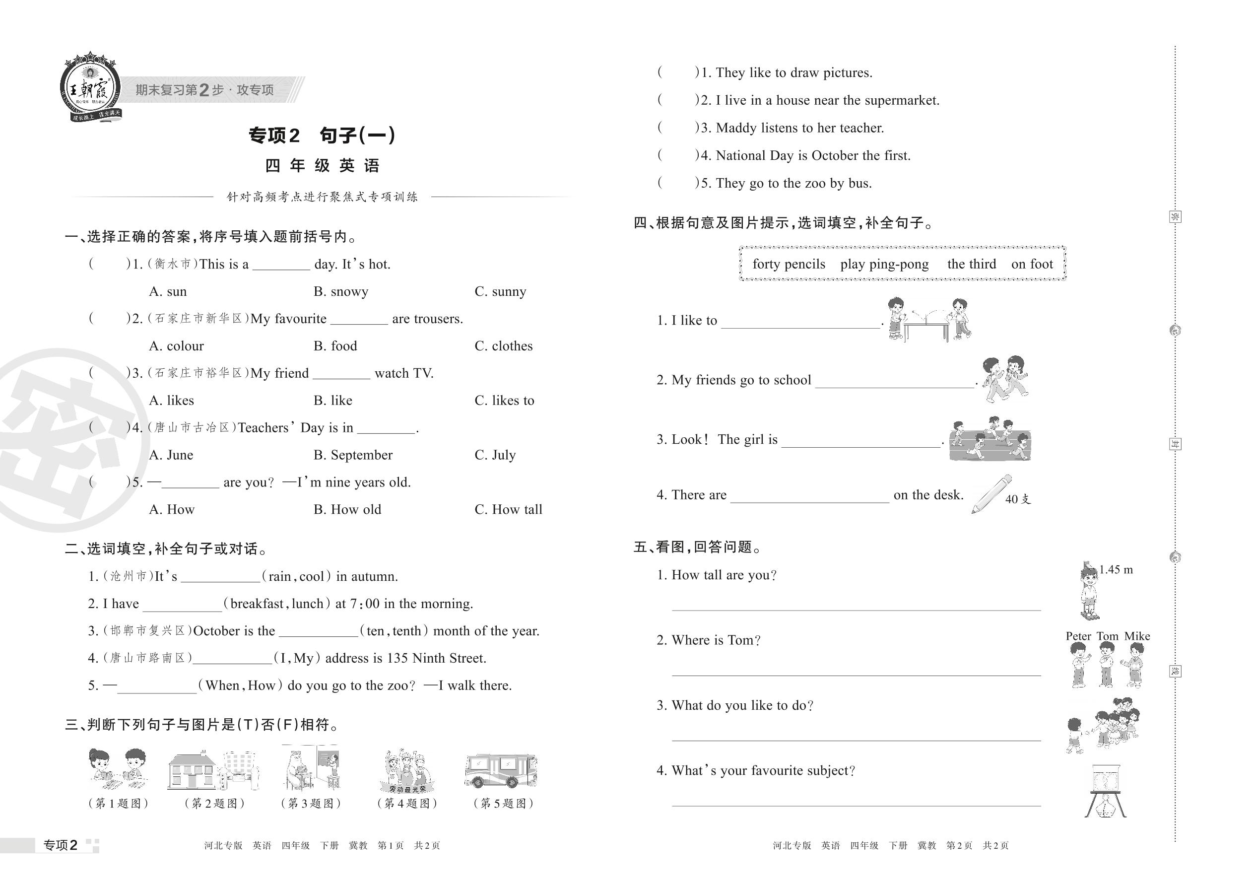王朝霞期末专项卷——句子(一)四年级下册英语(冀教版)【2】