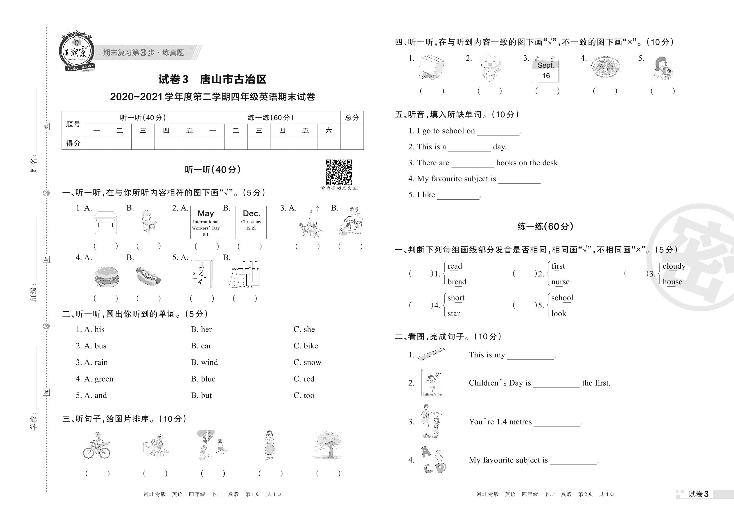四年级英语冀教版下册期末卷