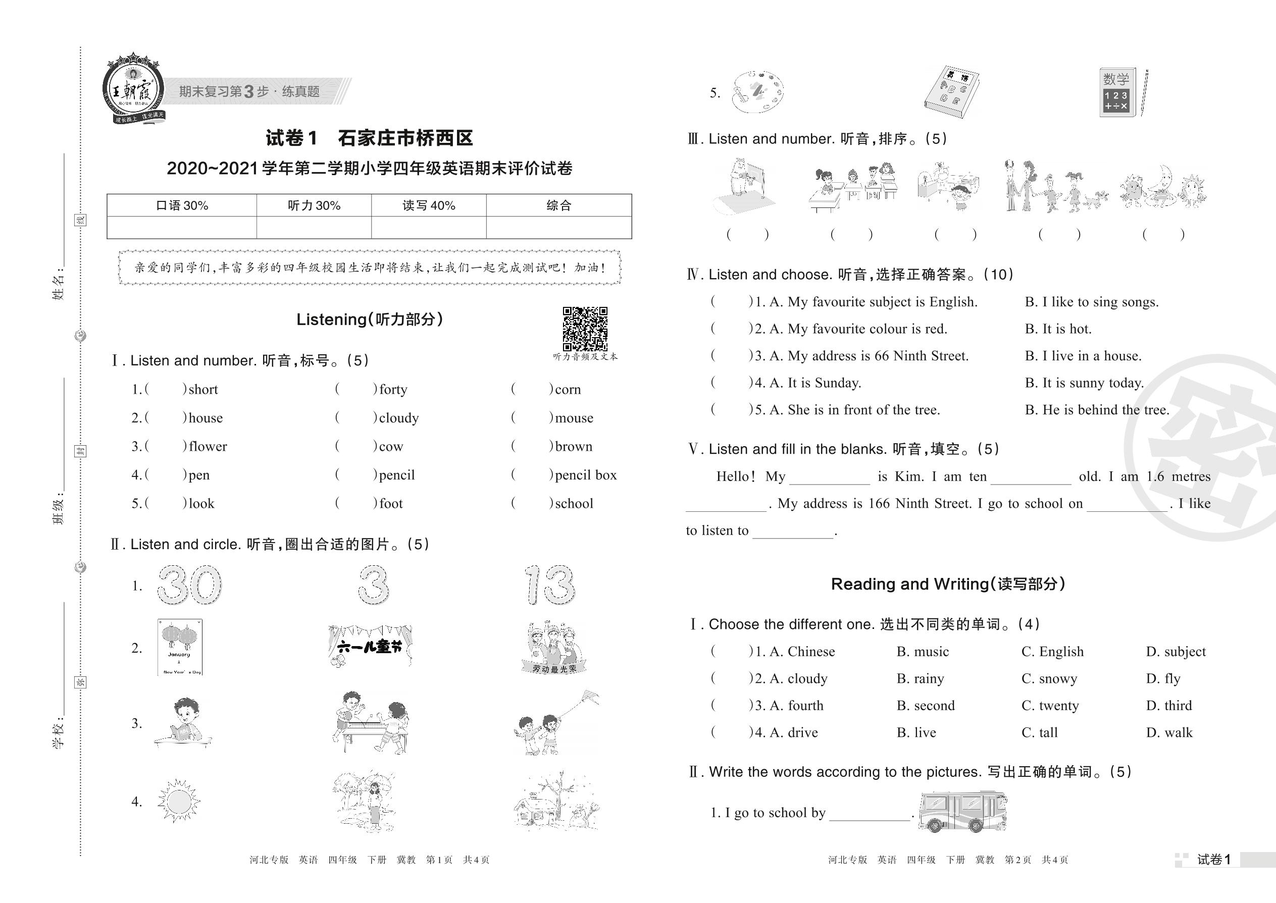 石家庄市桥西区2020~2021学年第二学期小学四年级英语期末评价试卷(冀教版)【1】