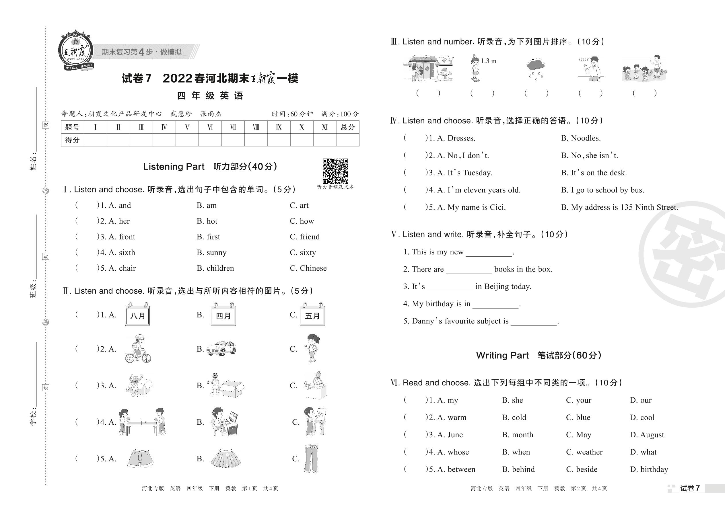王朝霞期末模拟卷四年级下册英语(冀教版)_R220328160229096【7】