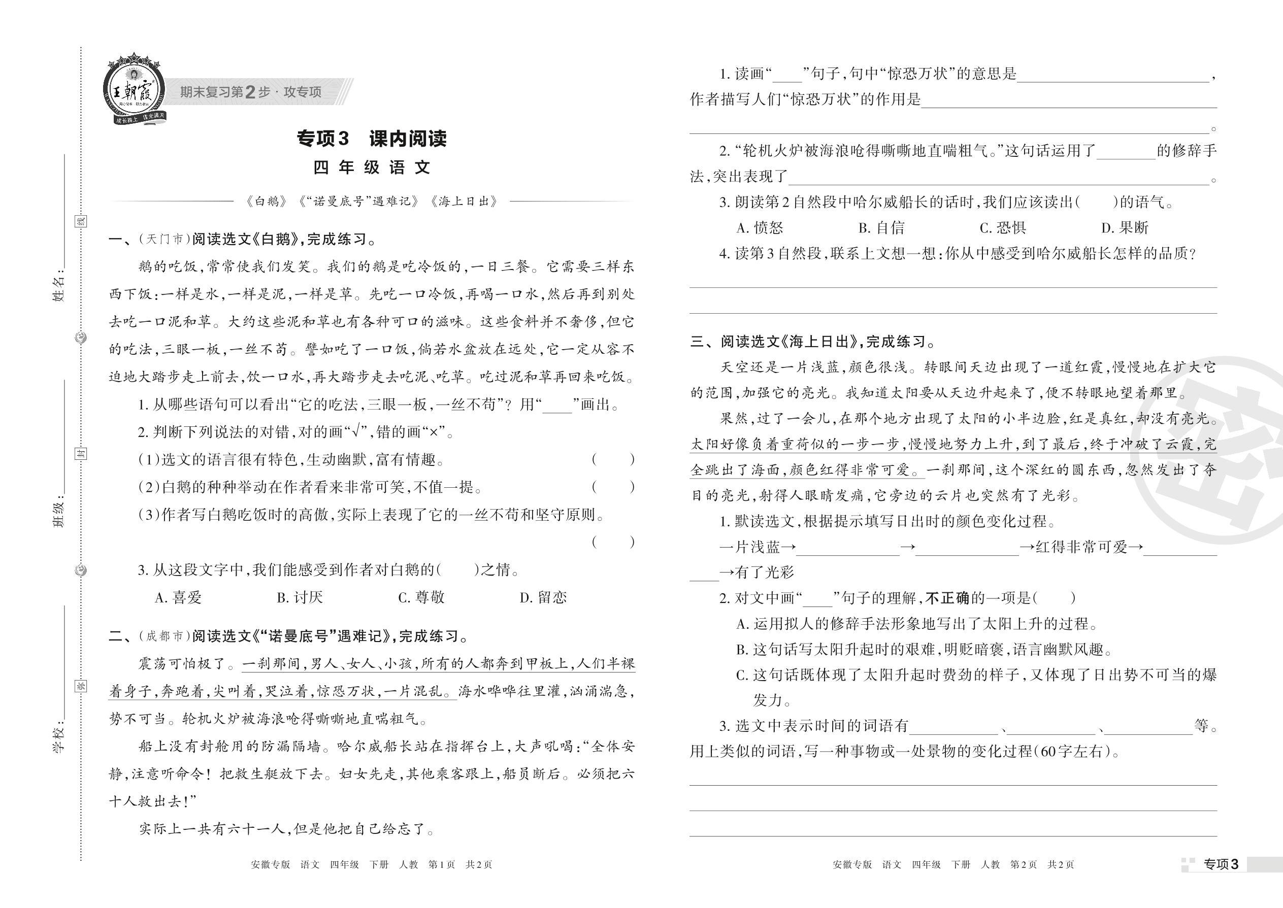 王朝霞期末专项卷——课内阅读四年级下册语文(人教版)【3】