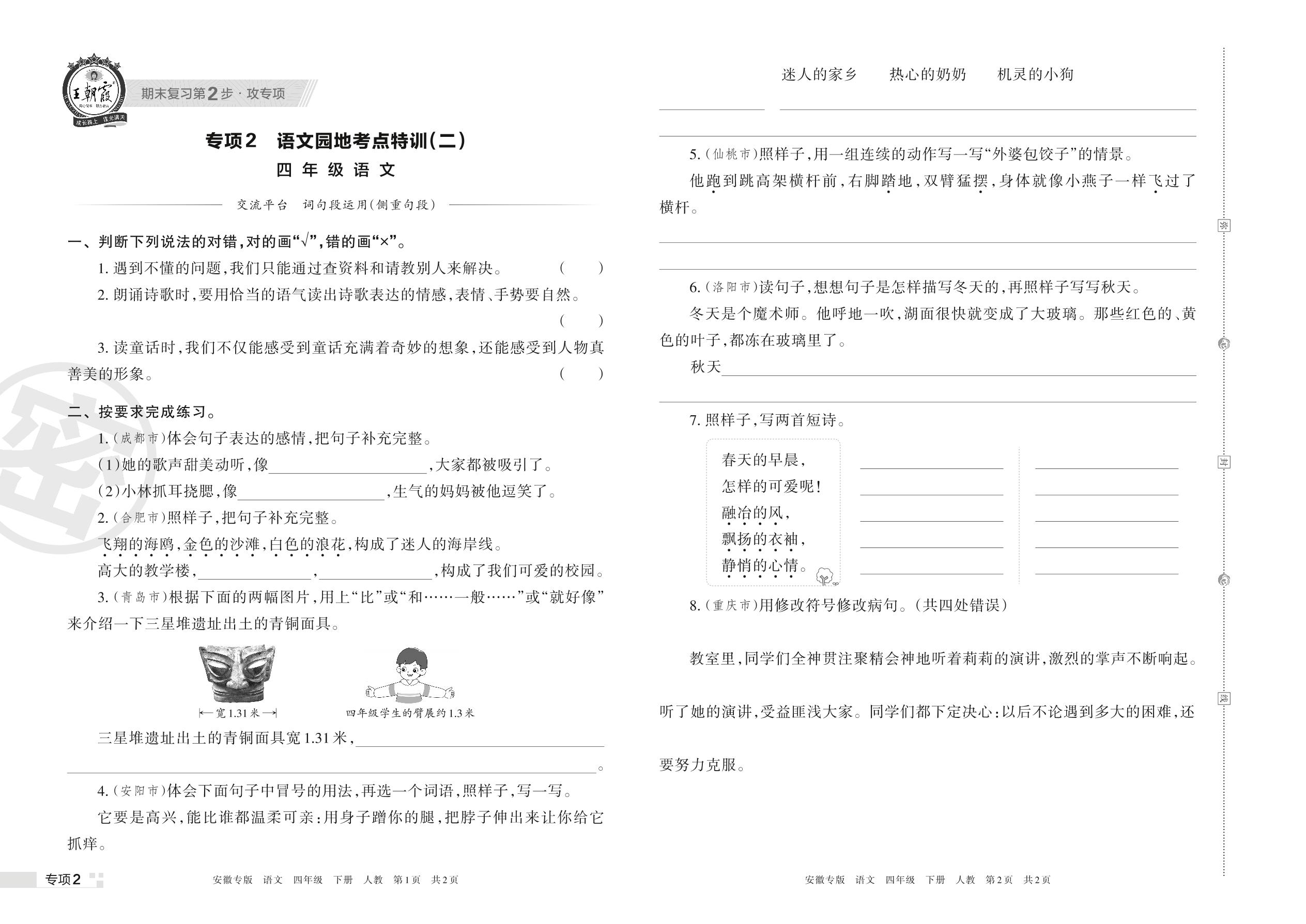 王朝霞期末专项卷——语文园地考点特训(二)四年级下册语文(人教版)【2】