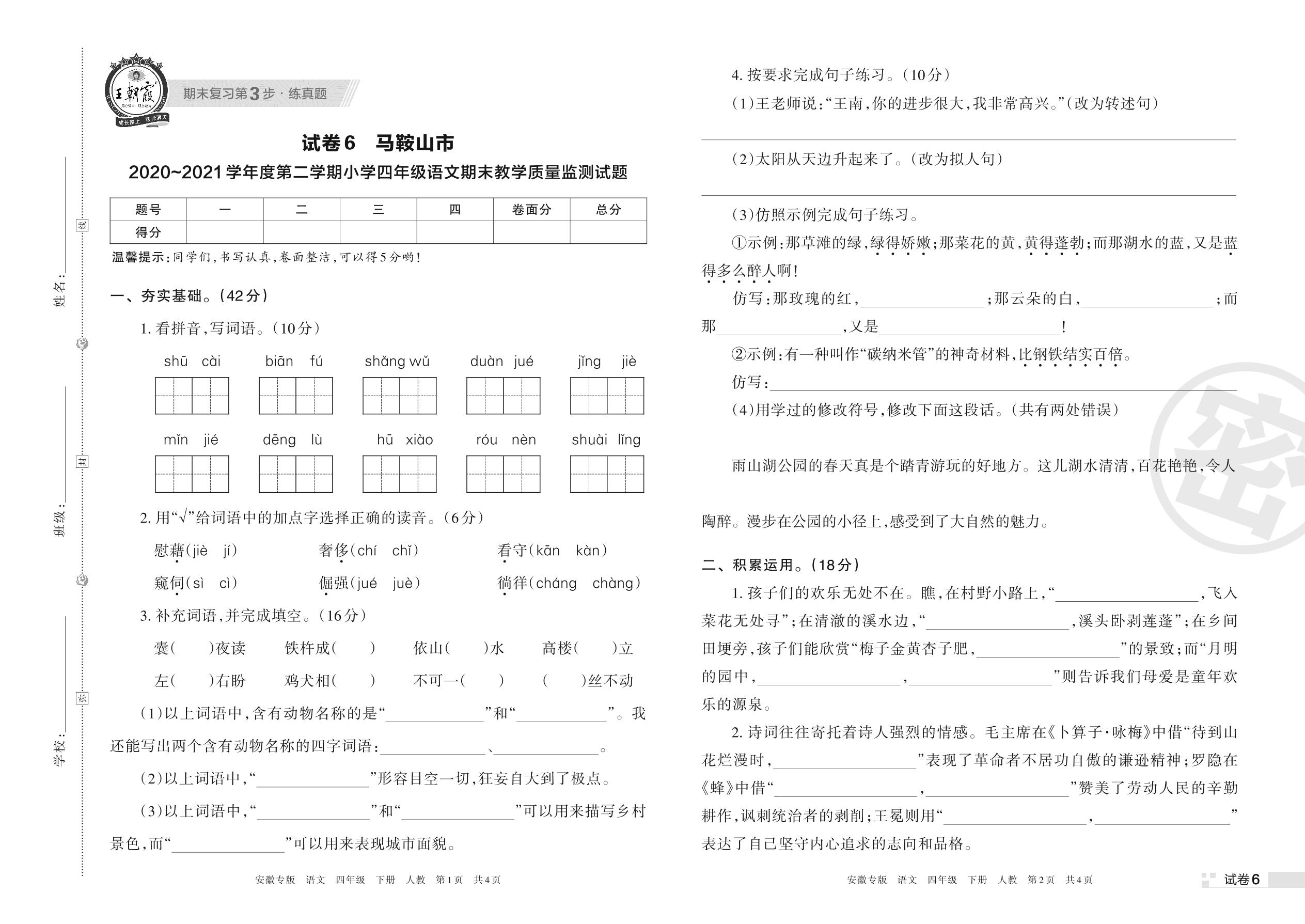 马鞍山市2020~2021学年度第二学期小学四年级语文期末教学质量监测试题(人教版)【6】