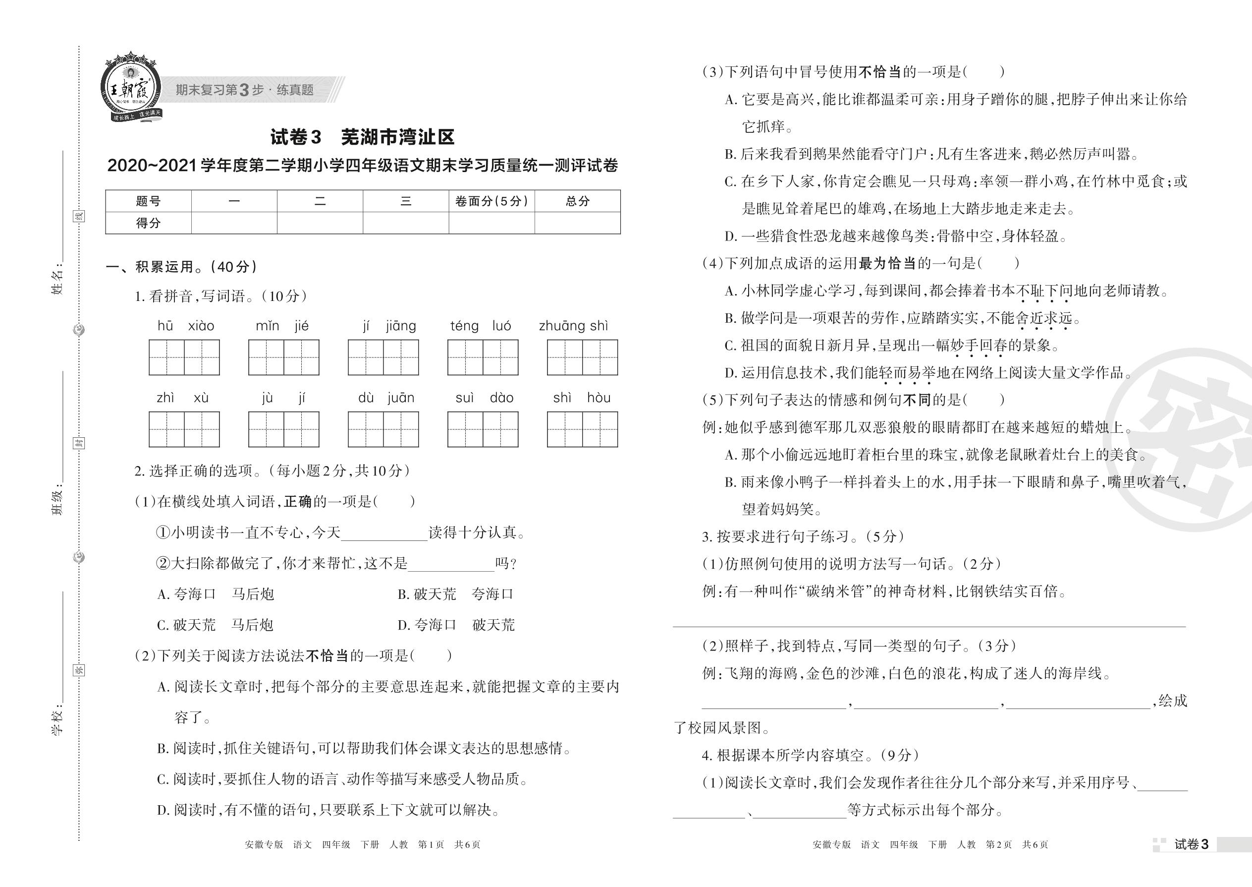 芜湖市湾沚区2020~2021学年度第二学期小学四年级语文期末学习质量统一测评试卷(人教版)【3】