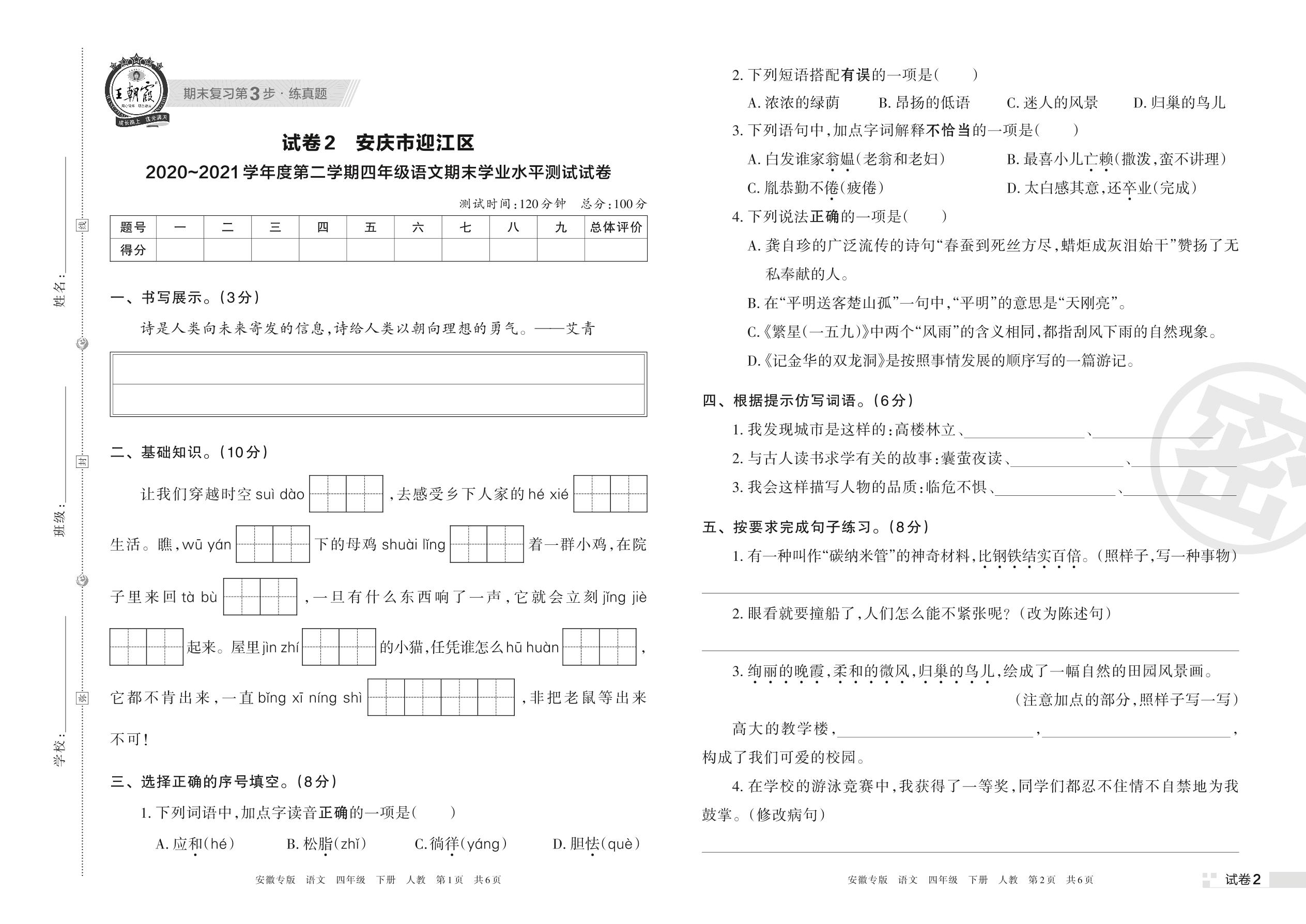 安庆市迎江区2020~2021学年度第二学期四年级语文期末学业水平测试试卷(人教版)【2】