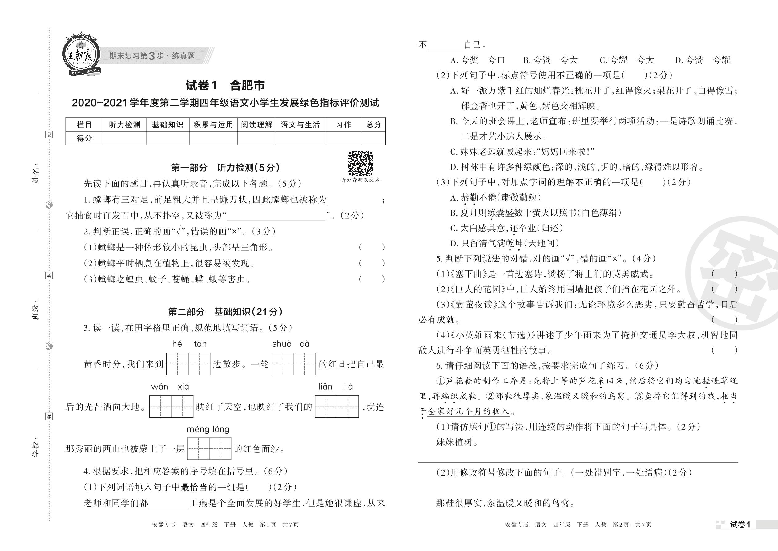 合肥市2020~2021学年度第二学期四年级语文小学生发展绿色指标评价测试(人教版)【1】