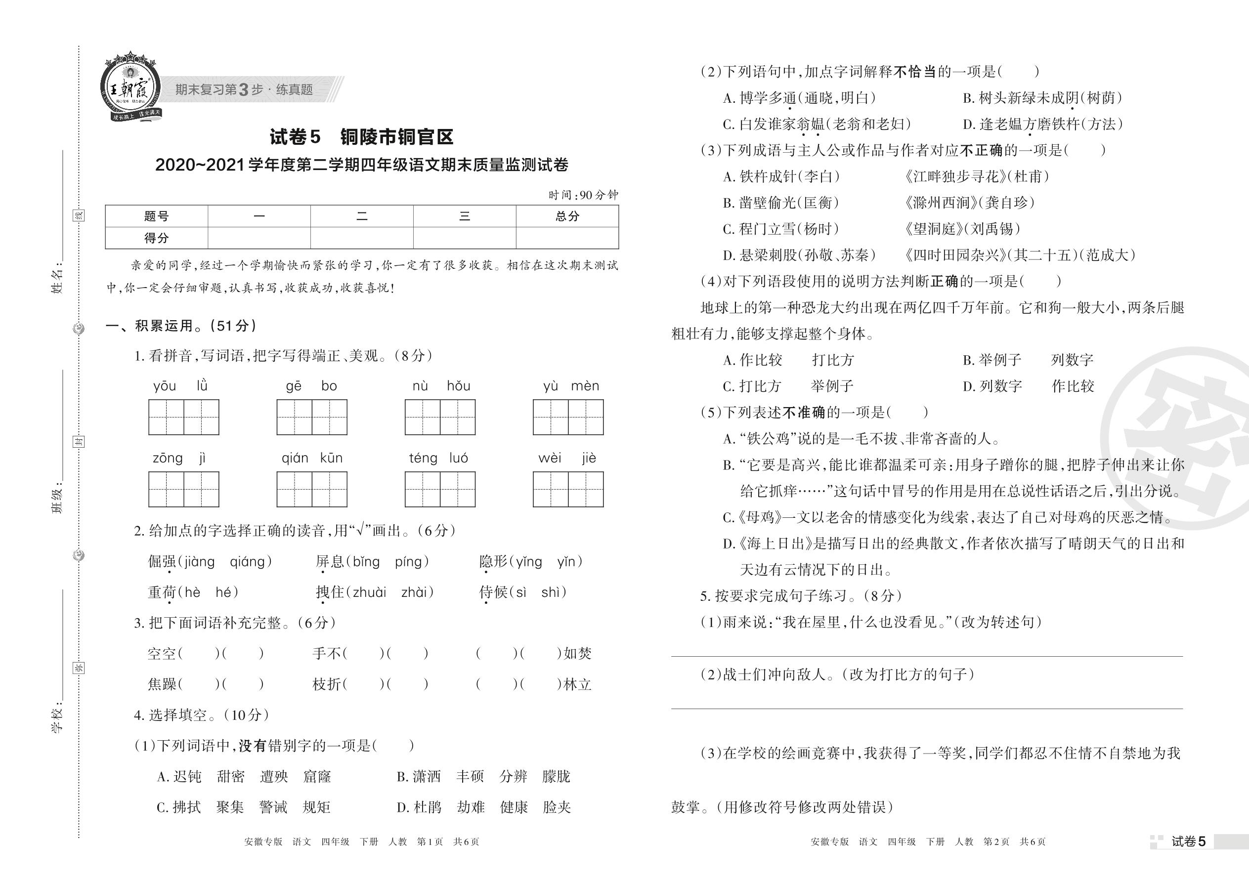 铜陵市铜官区2020~2021学年度第二学期四年级语文期末质量监测试卷(人教版)【5】