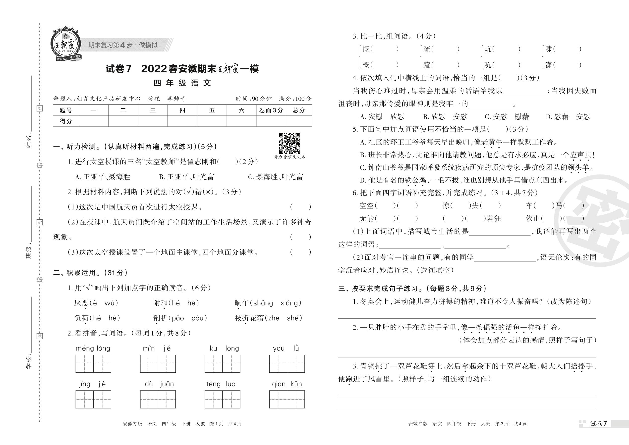 王朝霞期末模拟卷四年级下册语文(人教版)【7】