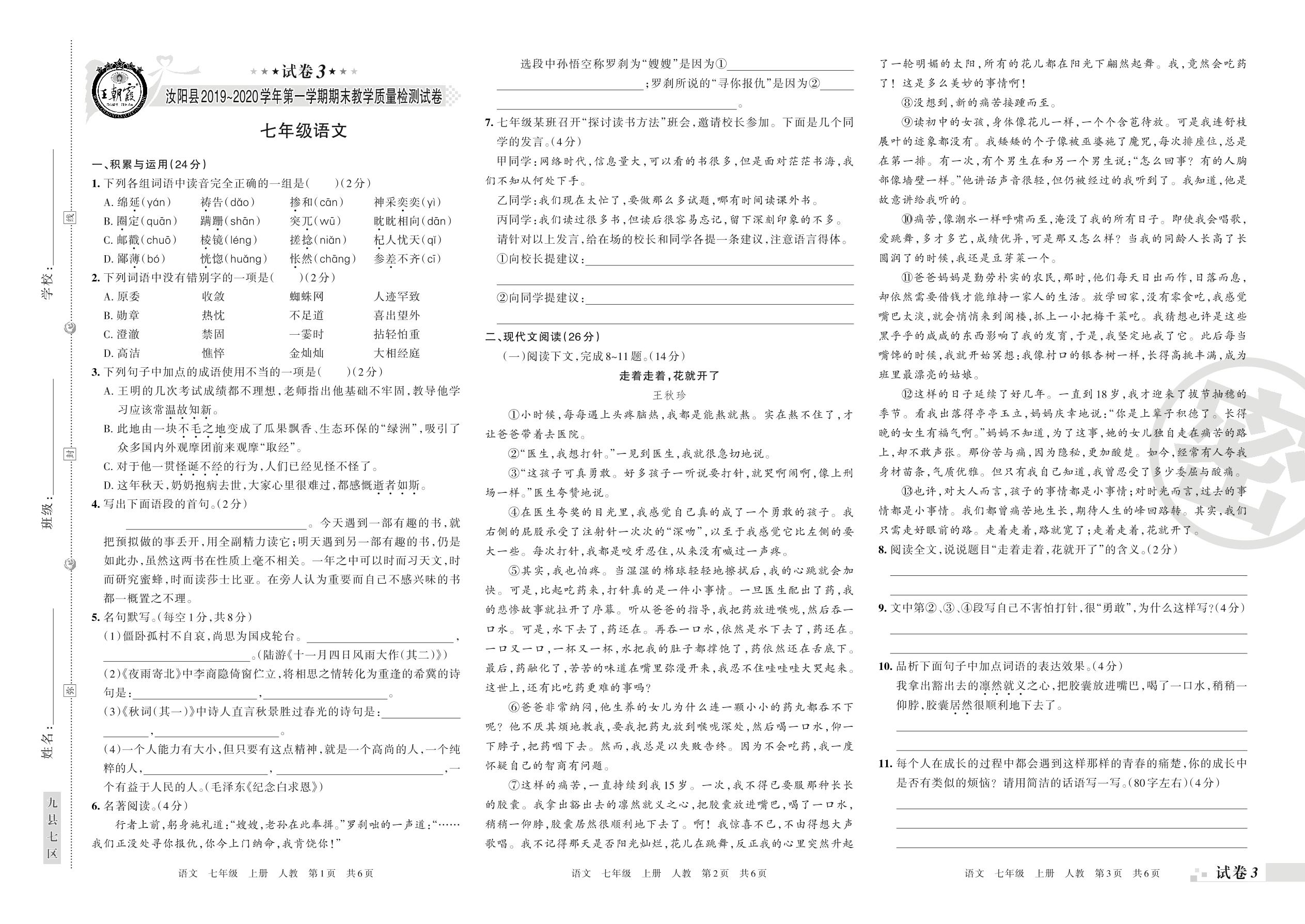 2019-2020学年第一学期洛阳市汝阳县七年级语文试卷(人教版)【3】