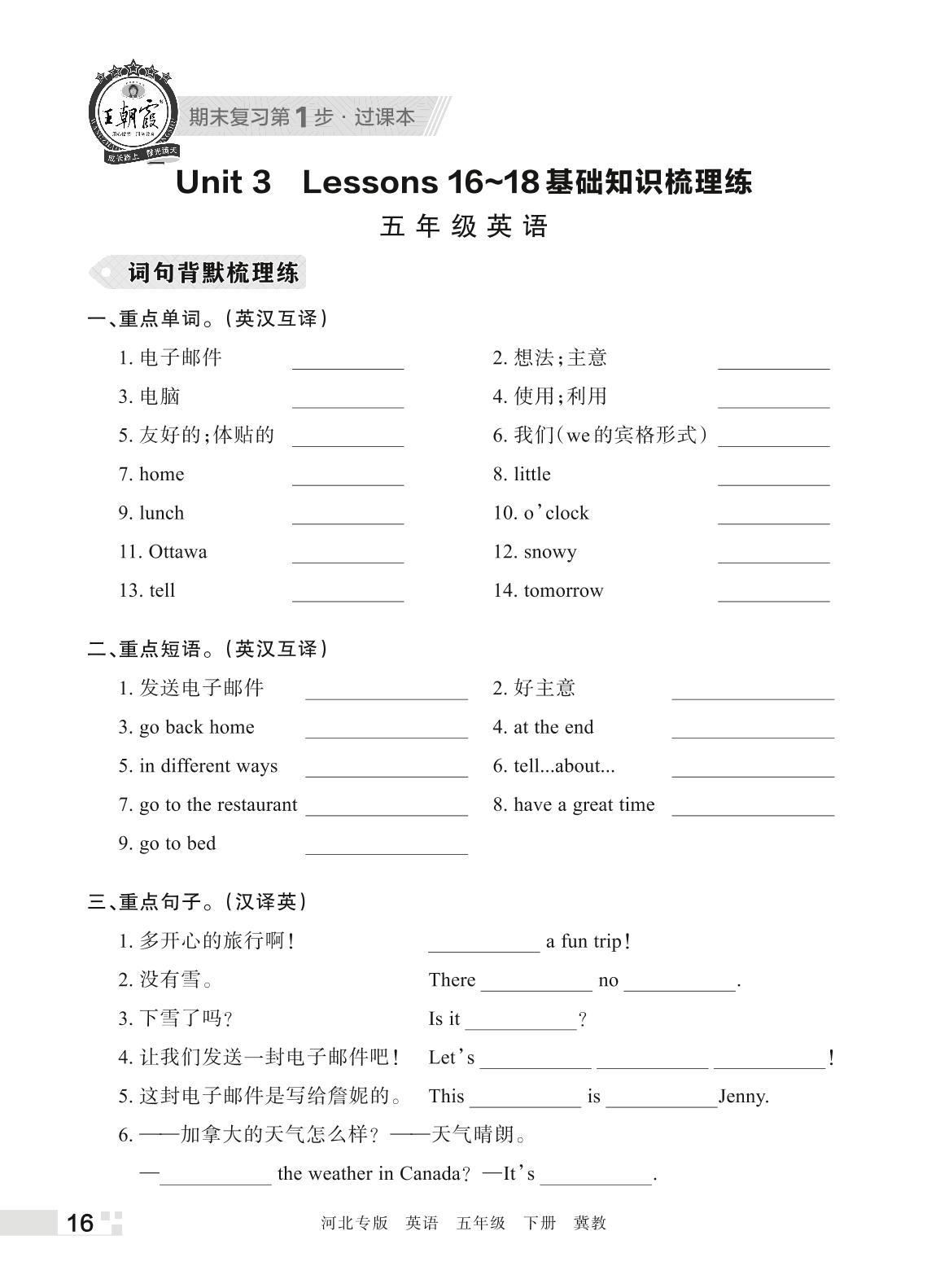 王朝霞期末过课本——Unit 3 Lessons 16~18基础知识梳理练五年级下册英语(冀教版)