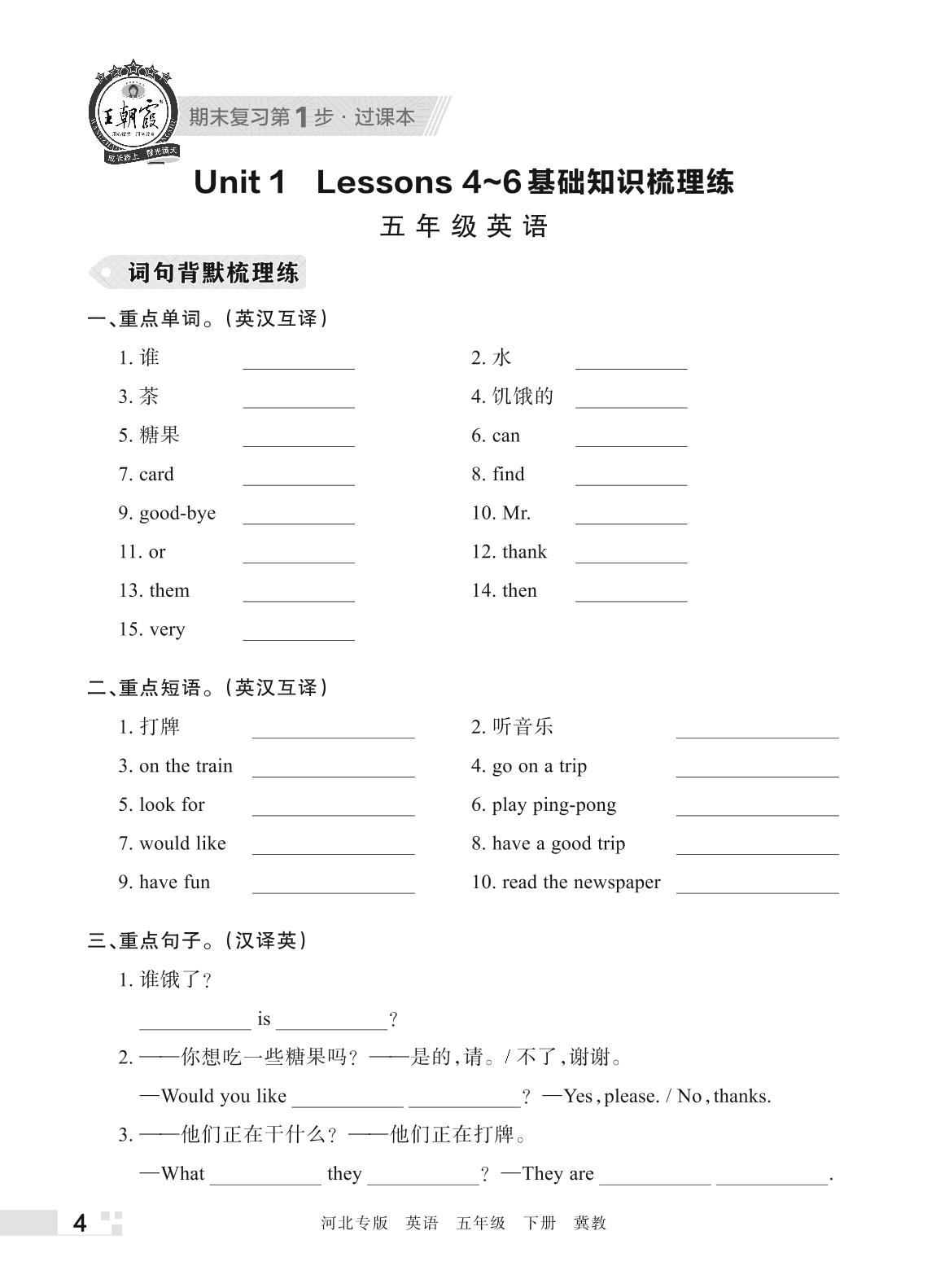 王朝霞期末过课本——Unit 1 Lessons 4~6基础知识梳理练五年级下册英语(冀教版)